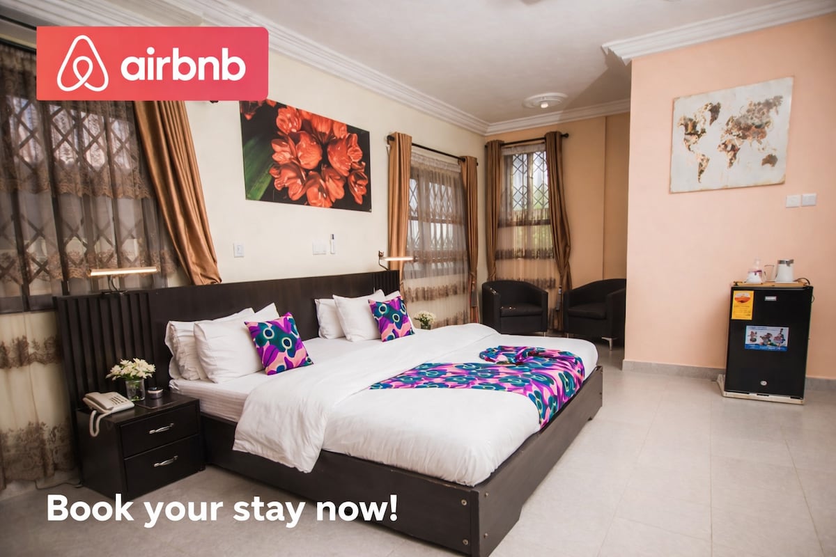 Alójate en el corazón de Accra en el GSP Hotel y disfruta de la comodidad moderna en nuestra elegante habitación Deluxe, diseñada exclusivamente para adultos que buscan relajación y comodidad. La habitación cuenta con una lujosa cama doble, decoración contemporánea, aire acondicionado, wifi de alta velocidad, TV de pantalla plana y un elegante baño privado con artículos de aseo de cortesía. Los huéspedes disfrutan de comedor en el hotel, servicio de recepción las 24 horas, servicio de limpieza diario y aparcamiento seguro. Perfecto para negocios o placer en un entorno céntrico y refinado.