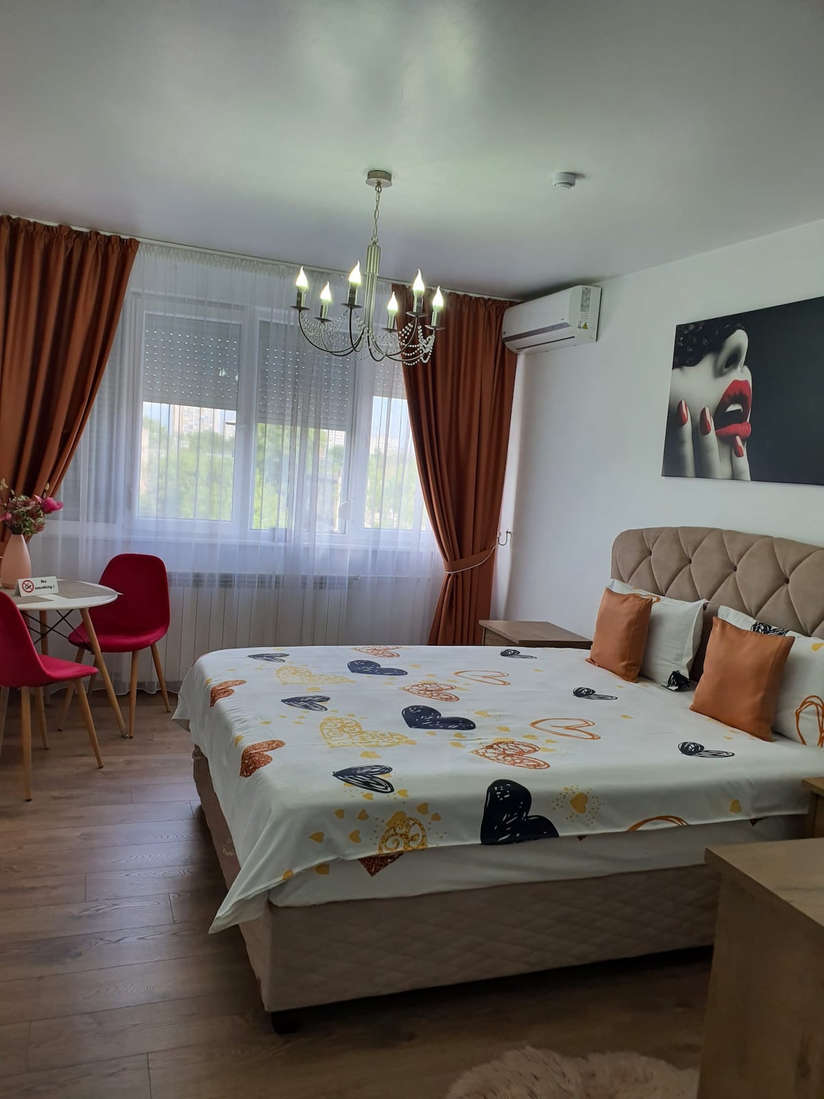 Apartamento acogedor, luminoso y acogedor, a 2,5-3 km del centro, en una zona tranquila. Cuenta con sala de estar con sofá cama, dormitorio con cama de matrimonio, cocina totalmente equipada (fogones, nevera, horno, tostadora y hervidor de agua), wifi rápido, TV y lavadora en un espacio separado. Ideal para estancias cortas o largas con fácil acceso a la ciudad, la estación de autobuses está enfrente de la manzana. Para ir de compras, Lidl y Penny están a 3 minutos a pie. El lugar tiene aire acondicionado. Segundo piso.