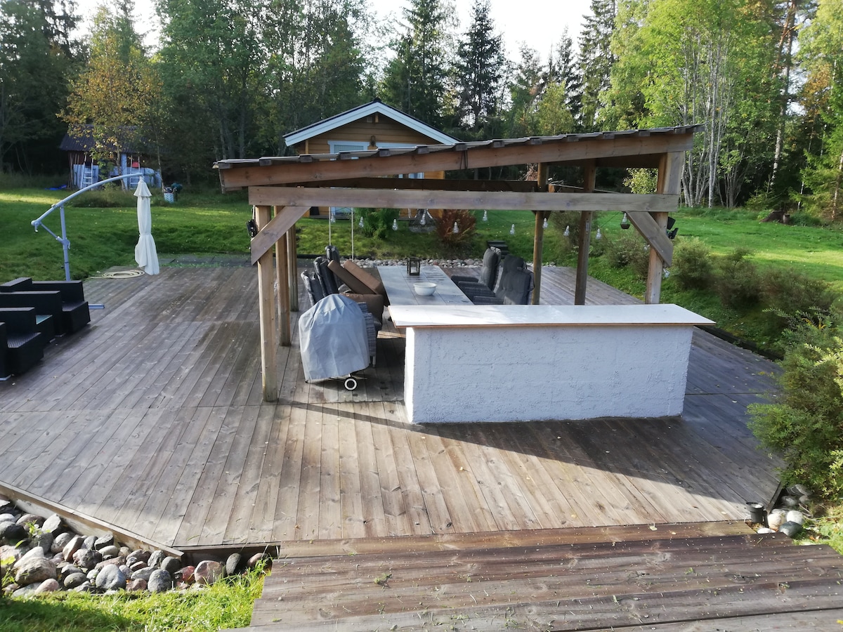 Casa moderna y amplia con impresionantes vistas justo al lado del agua donde podrás disfrutar frente a una chimenea de leña. Acogedores senderos para caminar, un montón de bayas y setas en los bosques y buenas oportunidades para nadar. Hay dos grandes terrazas: la superior está bajo el cielo abierto y la inferior tiene techo por si llueve. Excelente cocina con todo lo que necesitas. Hay dos plazas de aparcamiento si conduces aquí, así como un autobús municipal que para a 500 metros de la propiedad.