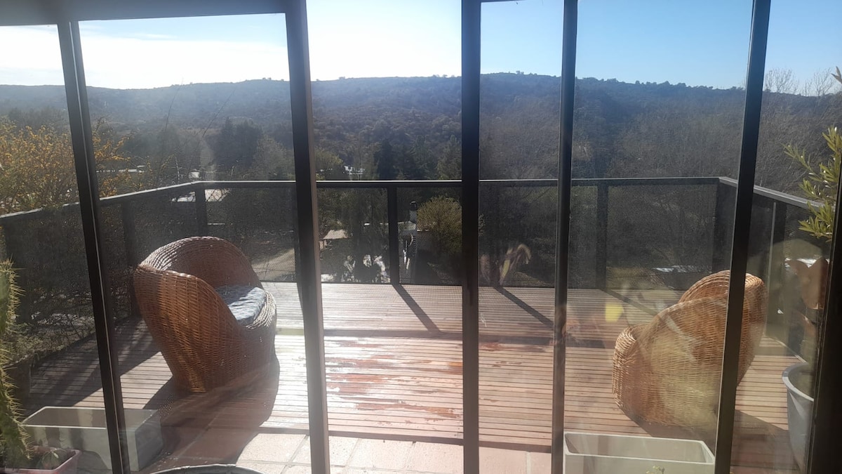 Casa Luz, es una bella cabaña rústica rodeada de naturaleza. Excelente ubicación, a 600 metros del circuito y del lago Potrero de los Funes. Cerca de restaurantes y atractivos turísticos. Las vistas son increíbles, 360 grados de sierras❤ que se disfrutan desde cada ventana. Ofrecemos wi fi, smart tv, aire acondicionado, heladera, cocina, microondas, cafetera, pava eléctrica, secador de cabello y plancha. Parque arbolado con chulengo y disco para los amantes de la cocina. Se aceptan mascotas!