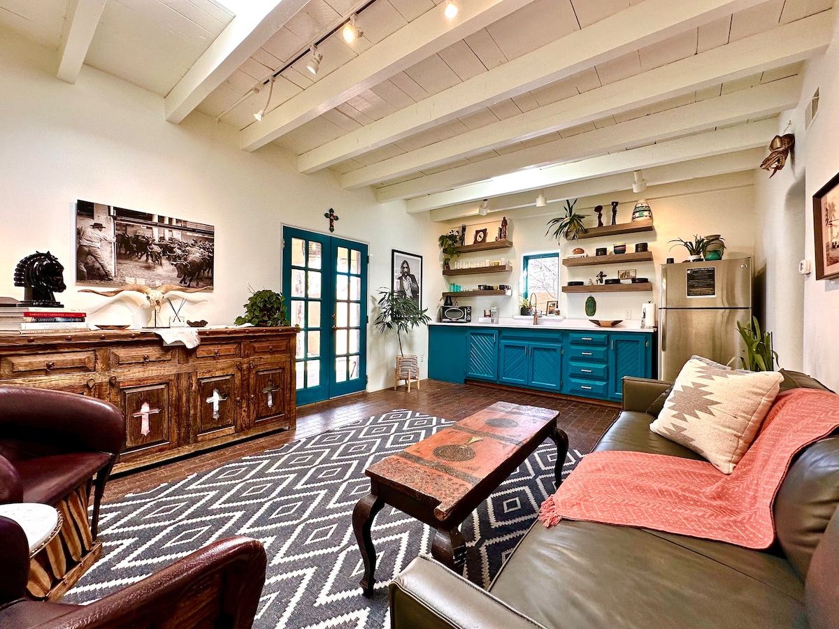 ¡Tan romántico! Esta nostálgica casa histórica de 1 dormitorio y 1 baño está escondida en privado detrás de paredes de adobe en una calle tranquila a pocos pasos del centro de la ciudad. Cargada con el encanto de Santa Fe: techos de vigas, una chimenea kiva de temporada, cocina completa y un hermoso patio privado con una cascada y un estanque koi. A poca distancia a pie del Railyard, la Plaza y la Canyon Road, llena de galerías. El wifi de alta velocidad y el aparcamiento fuera de la calle harán que tu estancia sea sin estrés. Cerca de todo, pero tranquilo y privado. ¡Mágico!