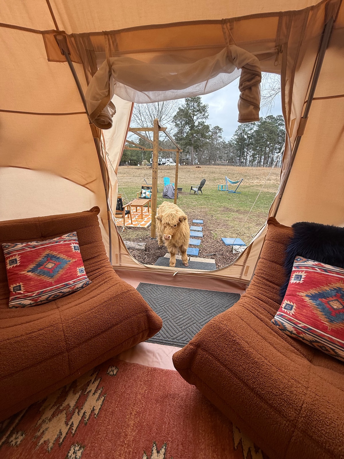 Enjoy a one-of-a-kind stay in the Cuddly Cow Yurt at Crawford’s Double O Farms, where fluffy Highland cows and friendly sheep roam freely nearby. You may even get surprise visits from our newest babies right at your door. Step inside your thoughtfully designed glamping retreat, blending rustic charm with modern comfort. Wake up to peaceful farm views, unwind under the stars, and experience a truly unique, immersive escape in nature.