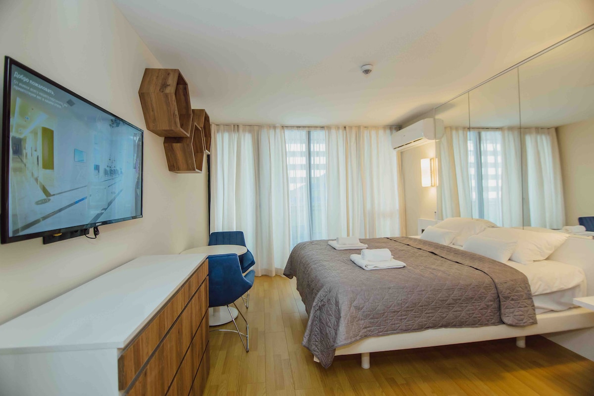 Nuestras instalaciones están decoradas con colores sencillos y elegantes. Cuenta con todo lo necesario para vivir y está situado en el centro de la ciudad. Ofrecemos no solo vistas al mar, sino también a la ciudad, al lago y a la montaña. Al mismo tiempo, nuestros huéspedes tienen la oportunidad de degustar delicias locales de forma gratuita, como el delicioso vino georgiano, el queso y el postre. Nuestras instalaciones son nuevas y tendremos sorpresas especiales para nuestros primeros huéspedes.