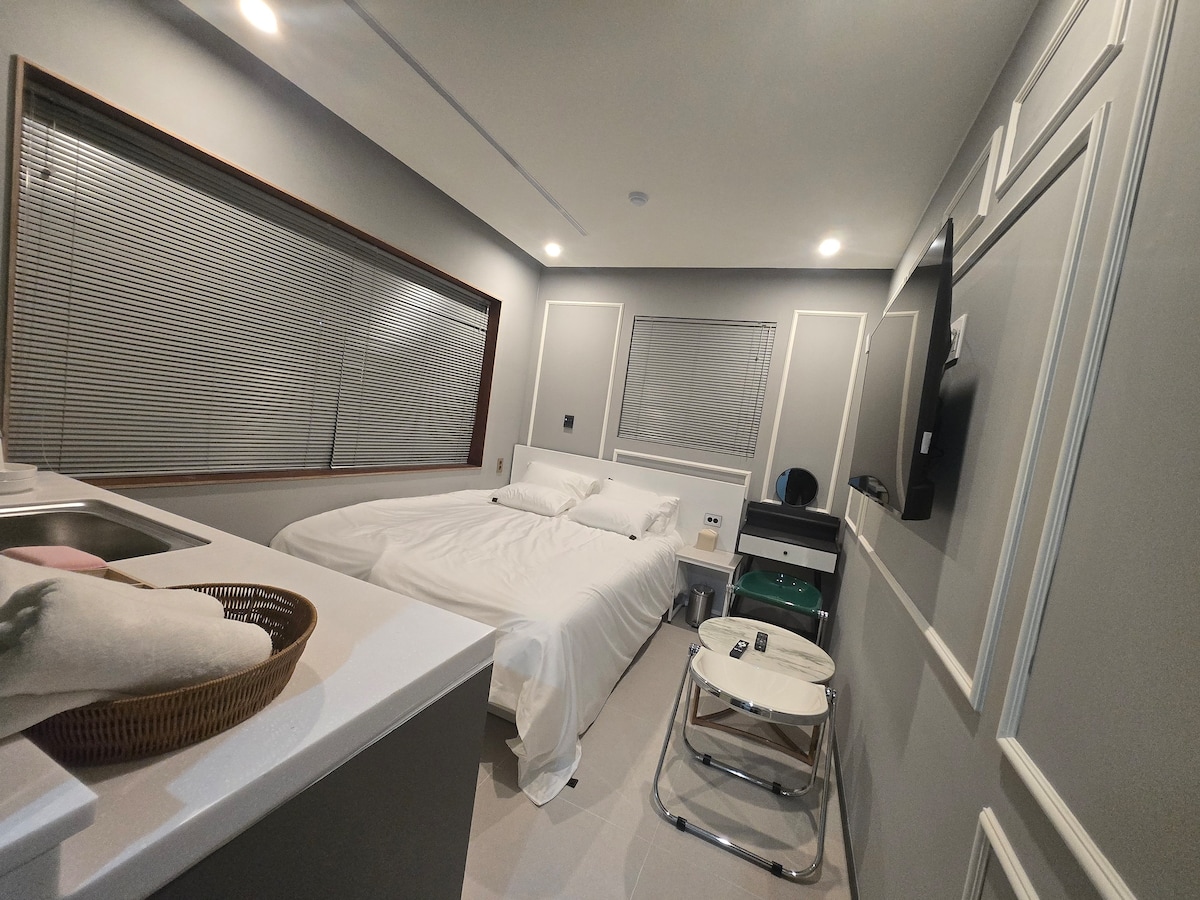 * A 5 minutos a pie de la tienda principal de la Catedral del Sagrado Corazón, * a 2 minutos a pie de la estación de Jungangno, * A 10 minutos a pie de la estación de Daejeon, a 9 minutos en coche del estadio de béisbol Hanwha. Tenemos una nueva cama doble donde podrás descansar cómoda y agradablemente, y está equipada con armario, mesa, silla, TV, nevera y espejo. También hay secadores de pelo y planchas rizadoras disponibles. En el baño después de olimodeling, ofrecemos champú, acondicionador, gel de ducha, pasta de dientes, cepillo de dientes, toalla y papel higiénico. La cocina compartida cuenta con lavadora, secadora, purificador de agua, inducción y utensilios de cocina, por lo que es muy conveniente para estancias largas. Se permite estacionamiento.