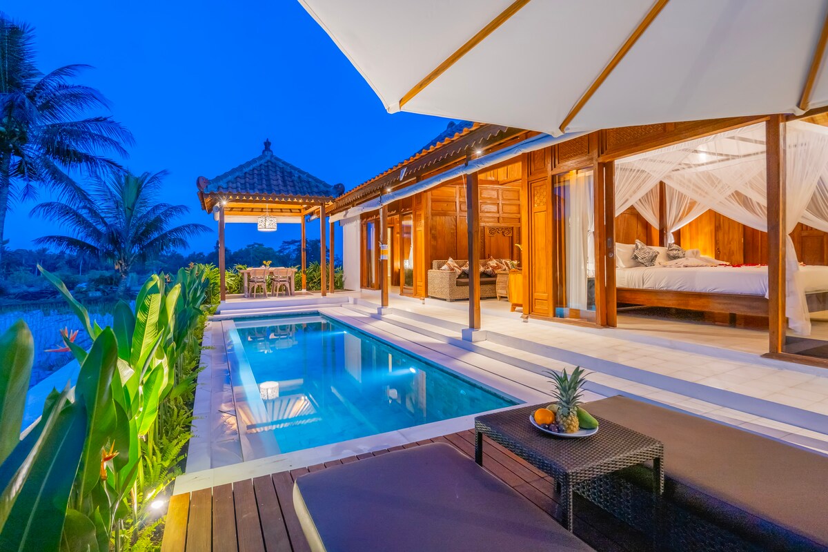 Valoración media de 4,86 sobre 5, 14 evaluacionesVilla de 2 dormitorios y 2 baños, piscina privada, vistas al campo de arroz.