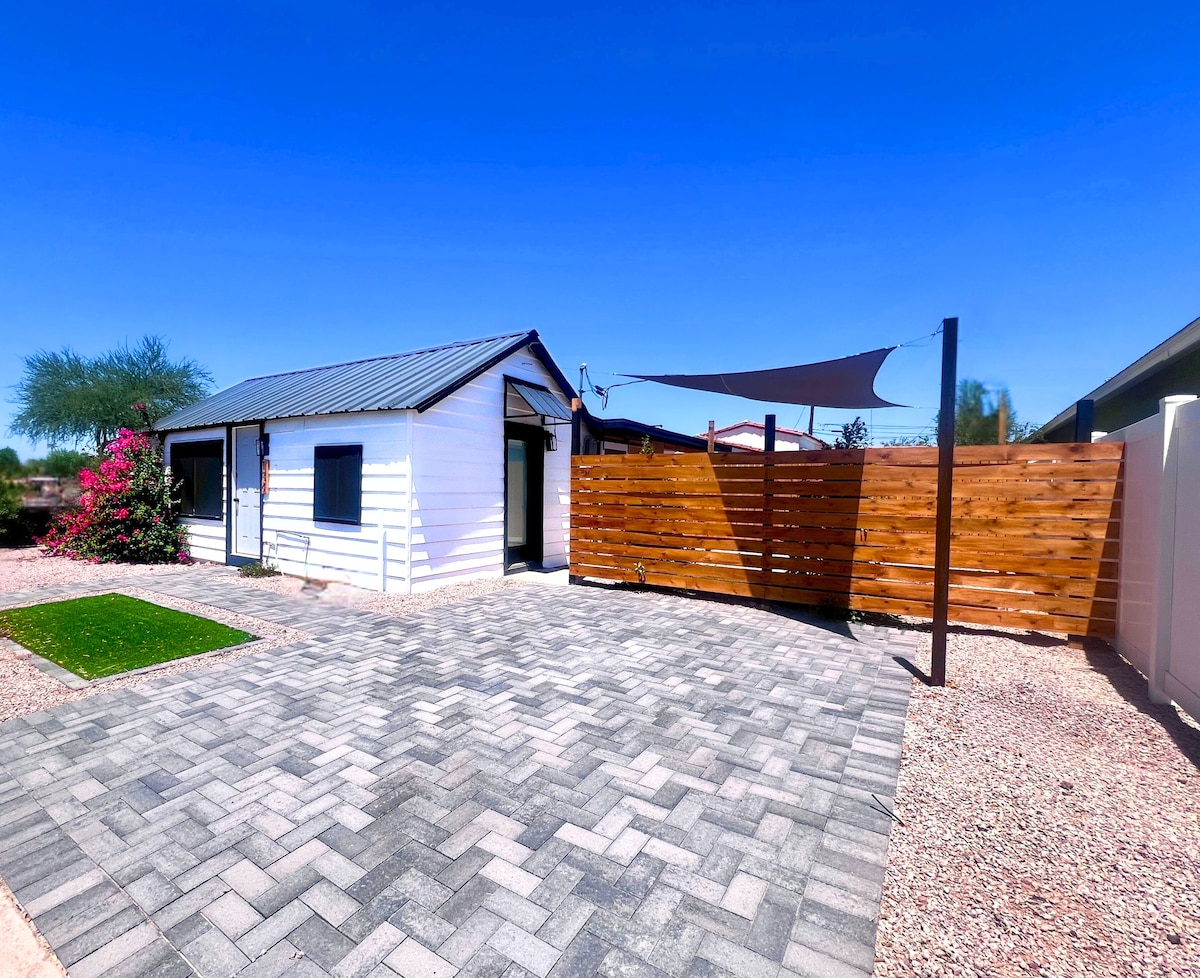 Operado de forma fiable por un Superanfitrión de AZ con más de 4400 estancias de 5 estrellas. ¡Un VERDADERO hallazgo! La mejor ubicación en Tempe: a pie del centro de la ciudad, bares y restaurantes en Mill, ASU (1,5 millas), Tempe Beach Park, etc. Casa de huéspedes histórica escondida con patio privado (e incluso una segunda ducha secreta al aire libre). Diseñado y configurado profesionalmente pensando en la comodidad del huésped, todo está aquí para ti: cama prémium, una estación de trabajo dedicada, cocina totalmente surtida, un espacio al aire libre para sentarse con luces de bistró. INCLUIDO 👇