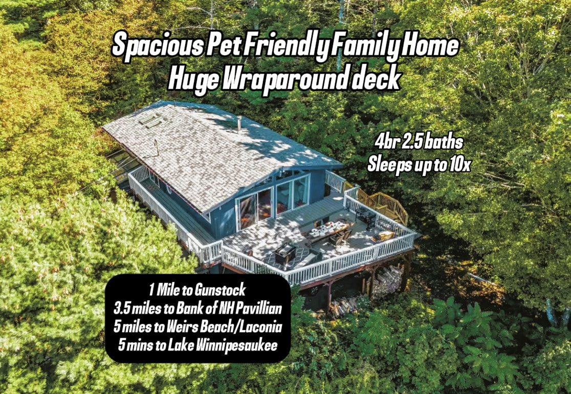 Casa de tamaño moderado, con tres dormitorios (uno king, uno queen, uno completo) ubicada en Gunstock Acres. La casa está a poca distancia a pie de varias rutas de senderismo pequeñas y a poca distancia en coche de varias rutas más avanzadas, como Mount Major. La casa se encuentra a 2,5 millas del Gunstock Mountain Resort con una serie de actividades familiares, a 8 millas de Weirs Beach en Laconia y a 13 millas de Meredith; todos con una serie de restaurantes y divertidas actividades familiares, incluidos los castillos de hielo.