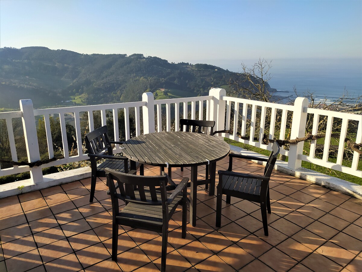 VILLA BAHÍA DE GETARIA - COSTA GIPUZCOANA DE GETARIA; WIFI, AMPLIA TERRAZA, GARAJE Y JARDÍN Amplio alojamiento para 13 personas distribuido en 4 plantas: garaje, planta con cocina y salón-comedor, planta de dormitorios y ático con dos dormitorios. Está situada en la entrada de Getaria desde Zarauz, a 100m de la playa y a una altura que permite tener unas vistas únicas. Además, cuenta con una de las terrazas más amplias del pueblo, así como un camino que conduce a un monte privado.