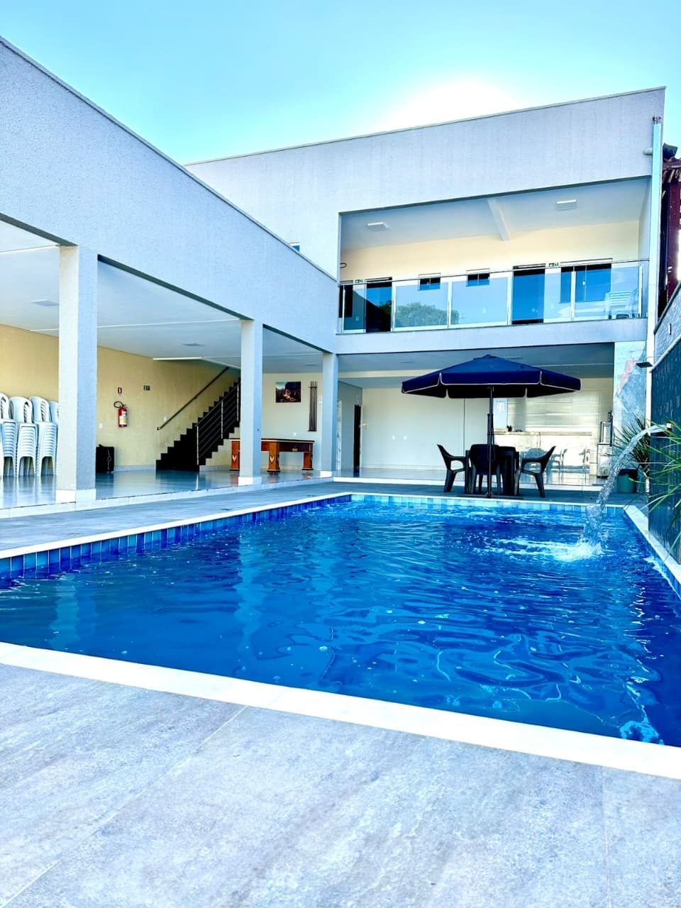 Espaço Ômega: el lugar perfecto para tu evento familiar Momentos inolvidables con piscinas para adultos y niños, zona gourmet con barbacoa, gran salón, cocina equipada y dormitorio con cama de matrimonio. Ideal para cumpleaños, bodas y reuniones. Dentro del alojamiento. ¡Reserva ya y celebra con comodidad y confort! Ofrecemos 15 mesas de juego con sillas Capacidad máxima 80 personas