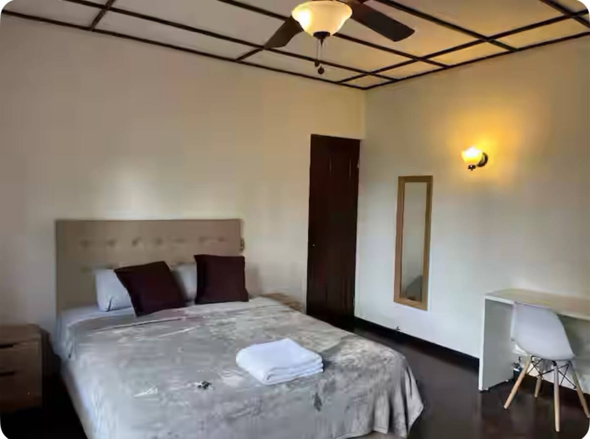 Somos Glori y Rigo una pareja costarricense que disfruta hospedar a personas en su hogar. Nuestra habitación es un espacio acogedor y tranquilo en un lugar muy céntrico en San José. Tendrás tu propio cuarto y baño totalmente privado. Podrás acceder a los espacios comúnes y utilizar la cocina, comedor y zona de lavado. Tenemos 2 perritas que estarán felices de conocerte Ambos teletrabajamos la mayor parte del tiempo por lo que podremos guiarte en lo que requieras