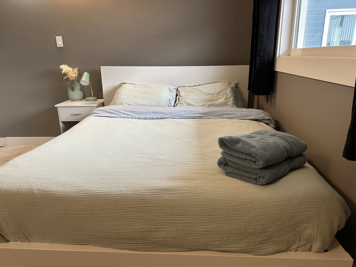 1 bedroom unit with a sofa bed (queen size) in a quiet neighborhood. Enjoy a private entrance, self-check-in, relaxing living area, kitchen, 3-piece bathroom and a laundry facility in the suite for your comfort and convenience. The kitchen is fully equipped with a stove, oven, microwave, refrigerator, rice cooker, blender, kettle and a coffee maker. The living room has smart tv (Netflix, YouTube) and wifi available. Parking is available with plug-in heater. Business Licence No: 07 008891