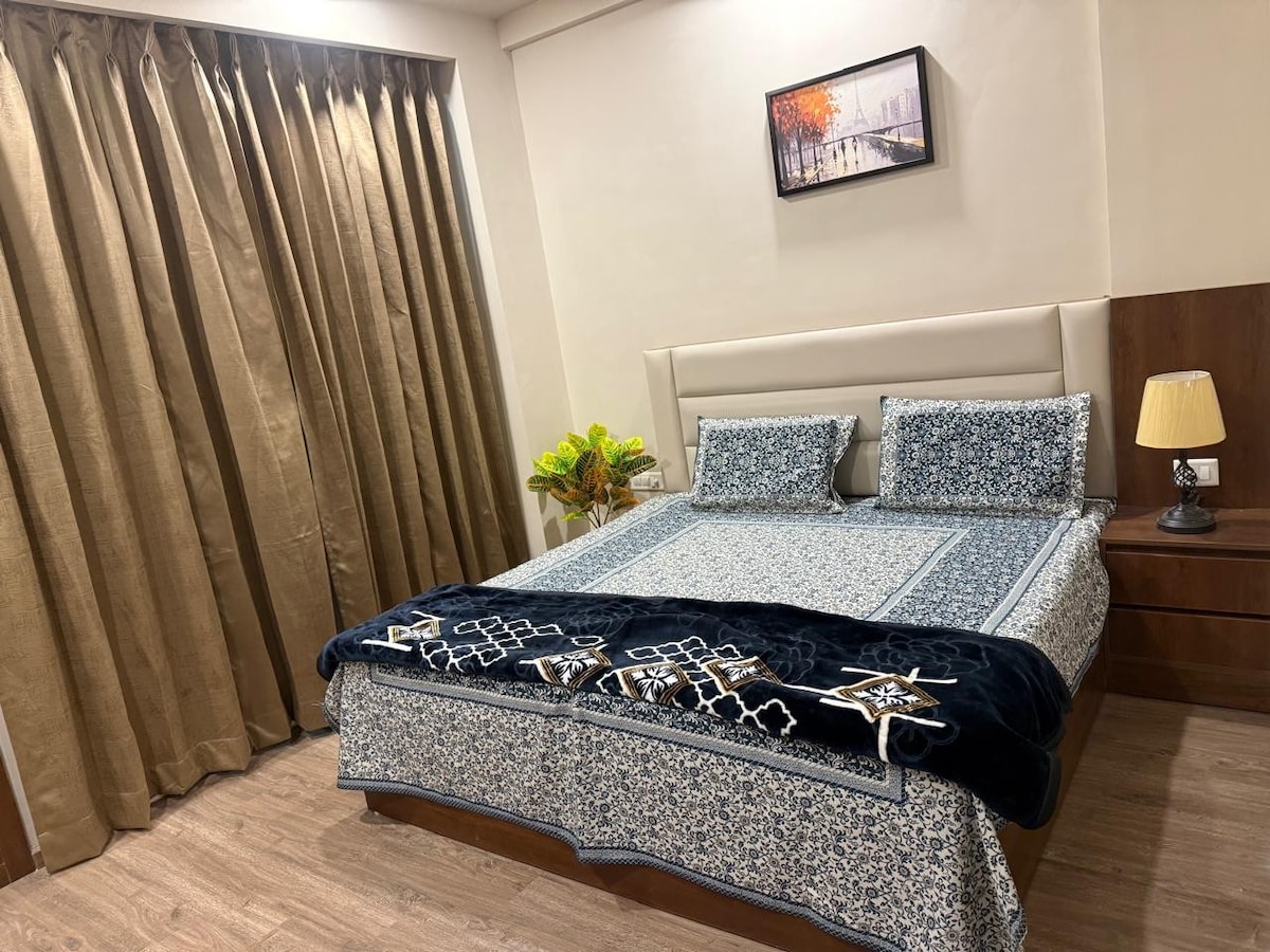 Nuestro apartamento de 2 dormitorios de nueva construcción combina la comodidad moderna con el encanto natural. El espacio cuenta con 2 dormitorios serenos con camas tamaño queen, una amplia sala de estar, una cocina bien equipada, 2 baños: uno adjunto al dormitorio principal y otro accesible desde la sala de estar y el segundo dormitorio y un balcón en forma de L que ofrece excelentes vistas de la ciudad. ¡La propiedad se encuentra cerca de un centro comercial prémium en Noida! Esta ubicación bien situada te ofrece la comodidad de tiendas, cafeterías y entretenimiento.