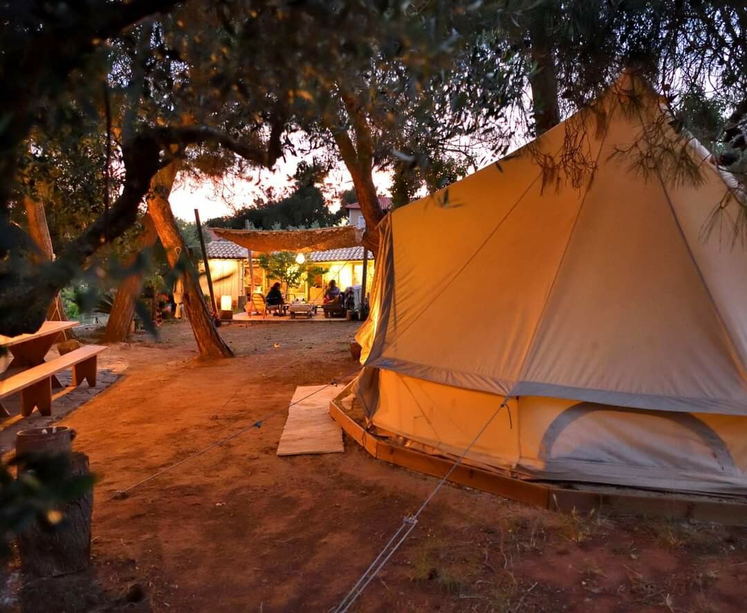 The bell tents are nestled between pistachio and olive trees. The bell tents are equipped with plush bedding, electricity and electric sockets with a plethora of usb ports, a pedestal fan and a clothes-hanger. We guarantee protection from nature creatures - mosquitos and bugs don't stand a chance with the 360-degree mesh wall and the mesh door. The luxurious shared toilets and showers are located just a few meters away from the tent. There is a private area with a picnic bench and a hammock.