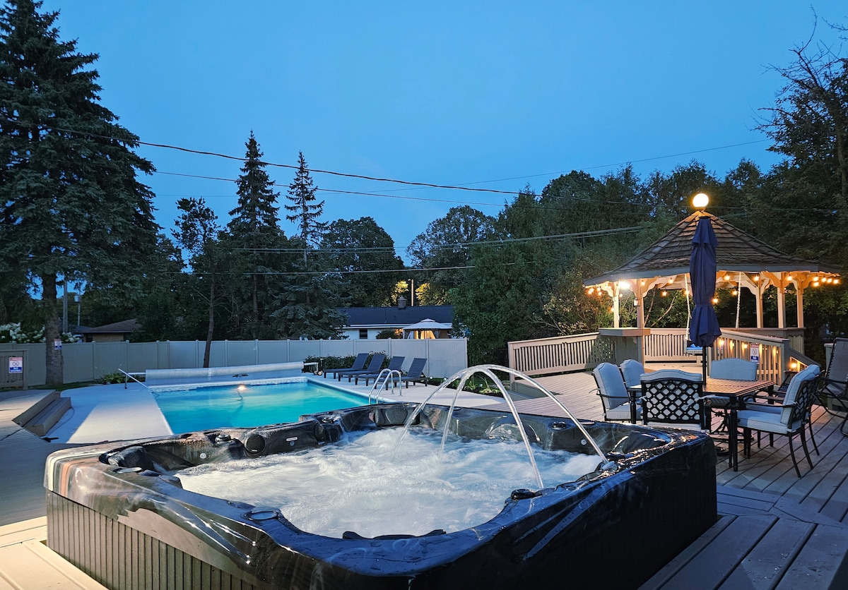 ¡3 dormitorios y 2,5 baños! Las zonas de estar cuentan con cómodos asientos y 4 televisores grandes de pantalla plana. La cocina y el comedor totalmente equipados son perfectos para comer juntos. ¡El patio trasero tiene un estanque para nadar, un fogón y una estación de parrilla! El entretenimiento en el interior incluye una sala de juegos, una sala de teatro y una zona de juego para niños. ¡Las atracciones cercanas incluyen Cave Point County Park y cerezos! * El estanque está abierto el Día de los Caídos (finales de mayo - Día del Trabajo (a partir de septiembre)* *Lee la descripción completa antes de reservar*