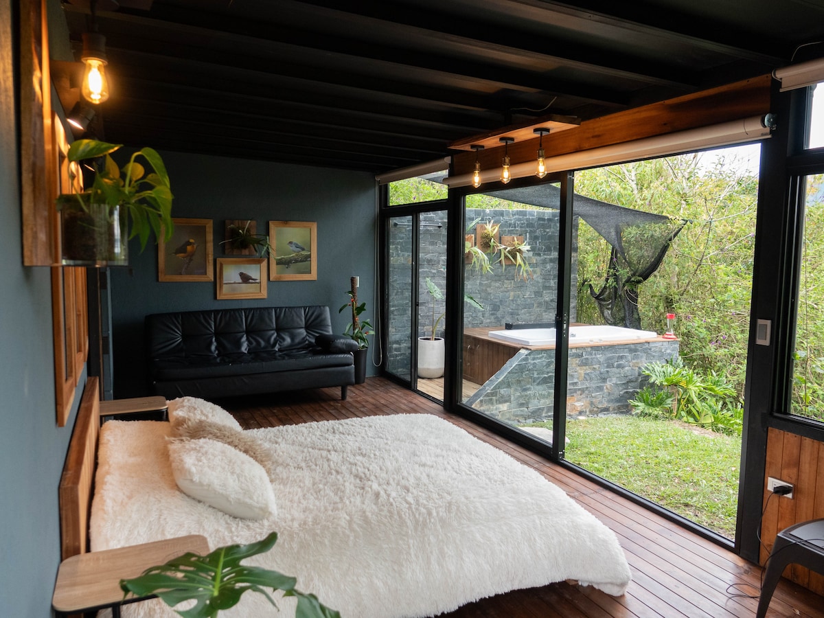 Una acogedora casa con una amplia terraza exterior con vista a la piscina y las montañas. Se pueden acomodar de 8 a 10 personas. Amplias zonas verdes. Se recomienda visitar una cascada con charco a 20 minutos caminando. Se ofrece servicio de climatización de la piscina por un costo adicional que dependerá del tiempo de uso.