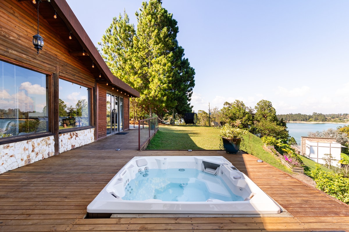 "Disfruta del encanto y la tranquilidad en nuestra tiny lake house en la mejor ubicación, un refugio perfecto 100% privado en medio de la naturaleza. Relájate en un jacuzzi de lujo mientras admiras vistas únicas a la represa y a la famosa Piedra del Peñol. Que además cuenta con una chimenea , y una cocina completamente equipada para todas tus necesidades culinarias un deck exterior, muelle. Perfecta para hasta 4 personas, es el lugar ideal para desconectar y crear recuerdos inolvidables."