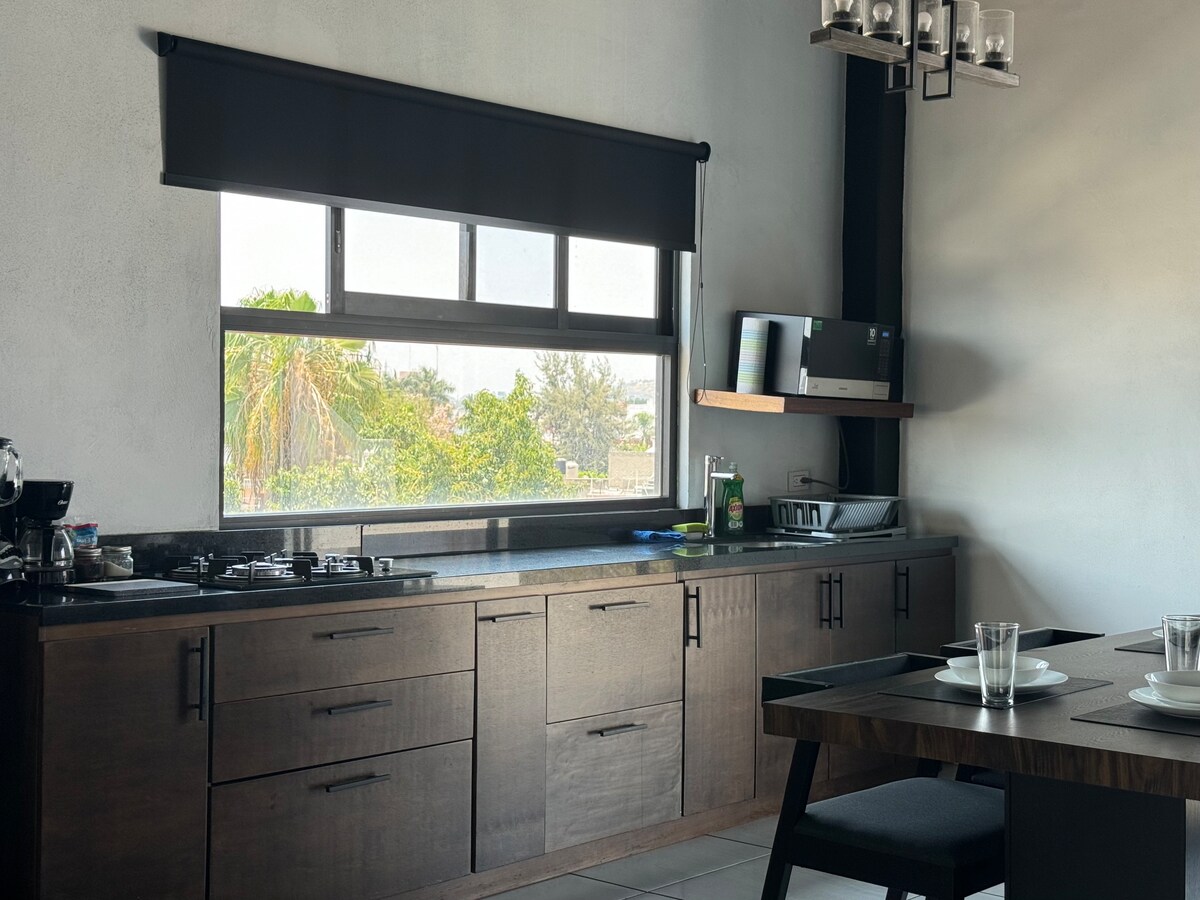 Amplio y confortable y totalmente equipado departamento contemporáneo, con vista al mar a tan solo una cuadra de playa, además cuenta con una terraza completamente privada para disfrutar de una hermosa puesta de sol, equipada con palapa, jacuzzi, sala de estar, baño completo, área de preparación de alimentos y asador de acero inoxidable tipo BBQ.
