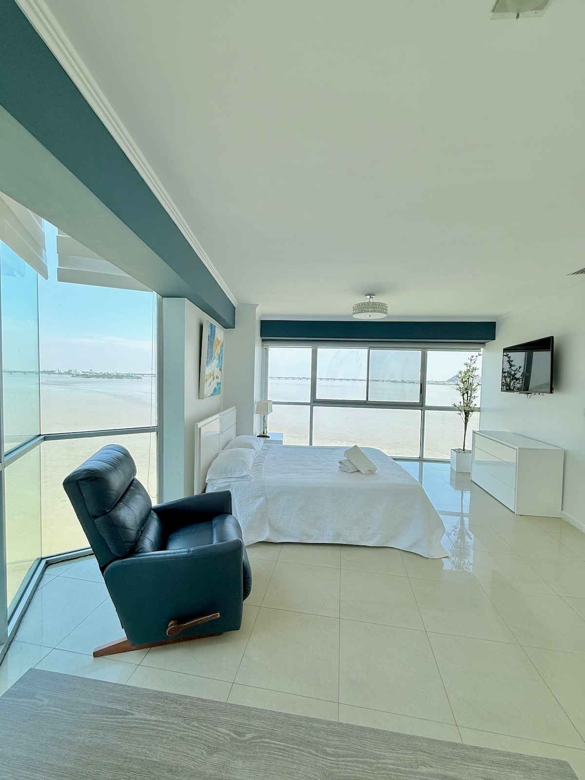 Disfruta de una excepcional experiencia en nuestra habitación en el edificio Riverfront 2: Desayuno incluido, excepto los Domingos, y del 24 de Dic al 3 de enero no habrá desayuno Cama de 2.5 plazas Cocina completa y equipada Ubicación privilegiada cerca del aeropuerto y centros comerciales. Además, se ofrece servicios como: Lavadora. Estacionamiento $10/noche Piscina, jacuzzi, Gimnasio. WiFi gratis. Recepción y seguridad 24 horas. Es ideal para una estancia segura, tranquila e inigualable