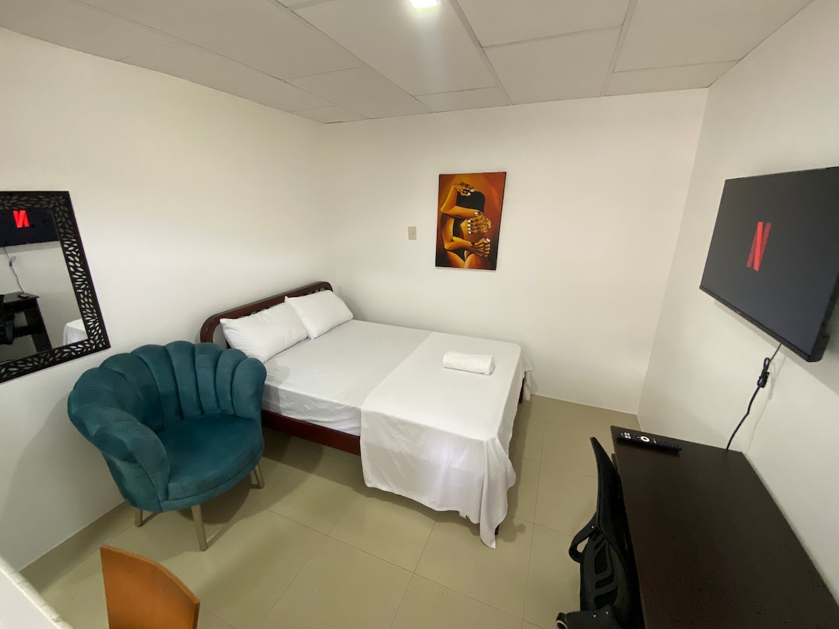 Relájate en esta escapada única y tranquila 🏡 Parqueo Privado doble garita seguridad con QR 🚘 Ideal para una persona 🙋♀️ Seguridad privada 👮♂️ Piscina en el club social 🏊 Tiendas y restaurantes cerca ✅ Aire acondicionado ✅ Wifi ✅ Cocina completa ✅ Baño privado ✅Entrada independiente ✅ Parqueo privado
