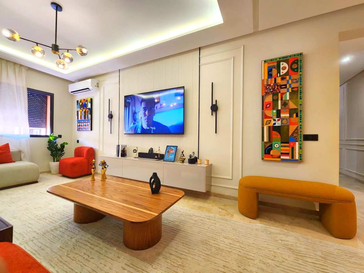 Experiencia inmersiva en un apartamento-galería contemporáneo. Perfectamente situado en el Triángulo de Oro festivo, a 15 minutos a pie de la medina. Este apartamento de muy alta gama de 140 m² luminoso y acogedor. A dos pasos de los palacios emblemáticos (Mamounia, Sofitel, Casino) Residencia de prestigio con piscina. Ideal hasta 5 huéspedes, ofrece 2 habitaciones, 3 terrazas, 2 baños y 3 aseos. Entre ambiente de moda y animado, te espera una experiencia única en el corazón de Marrakech.