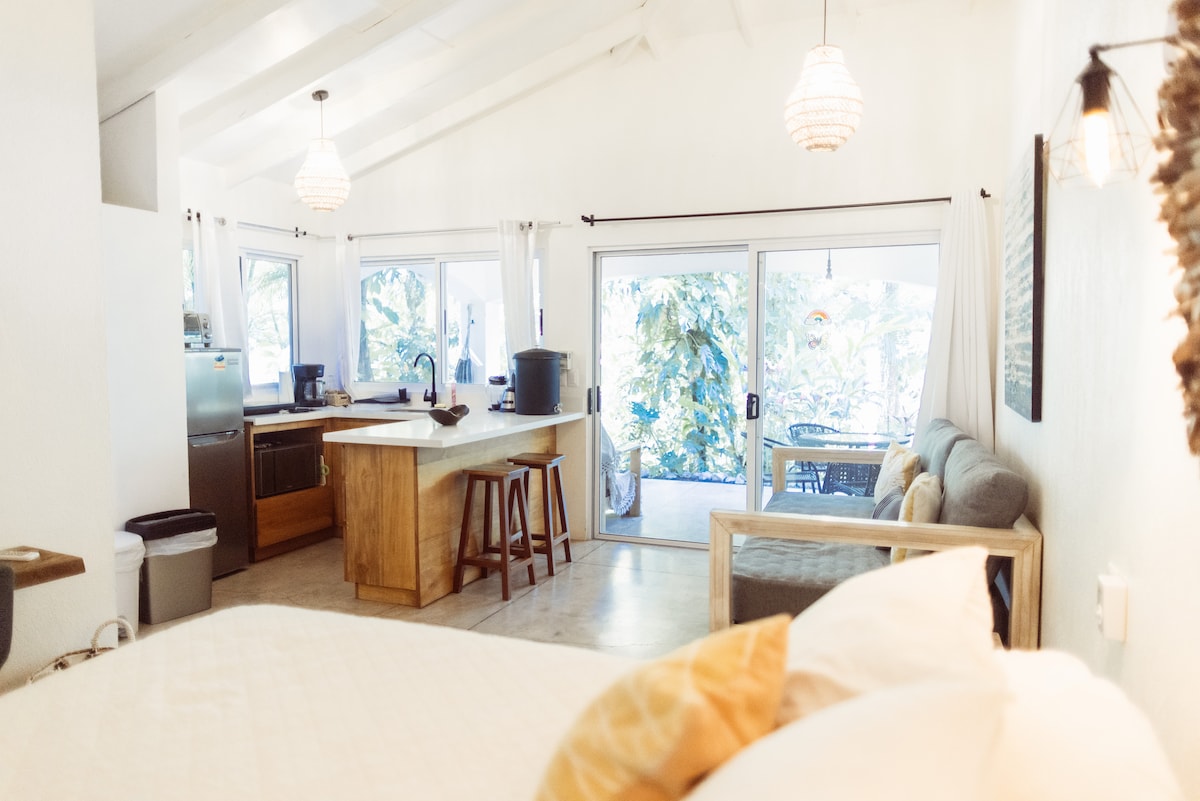 Casa Sol is a cozy one-bedroom with A/C, living room fan, and 100 Mbps fiber WiFi. Just 3 - min drive from Guiones town and top surf spots, it offers both convenience and tranquility. A car is recommended, though a brand-new supermarket is within walking distance. Surrounded by nature and local families, it’s the perfect spot to relax after surf or yoga. It's twin unit, Casa Mar, was featured by Forbes as one of Costa Rica’s “10 Best Airbnbs” in 2024.