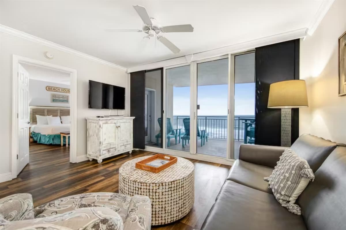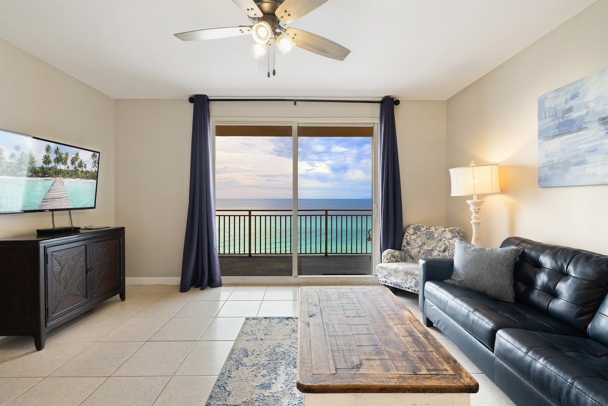 Amazing breathtaking Ocean & Main strip view! Perfect location just across the street from the white sugary beach and the ocean. Just 15 minutes WALK! to the World famous Pier Park! You can watch fireworks from your own balcony! Several beachfront restaurants are just across the street. The fully equipped kitchenette has everything you might need for a comfortable stay. Accommodate up to 4 guests! **Rare find: FIREPLACE in the unit/Free parking/Self check-in/Heated pool/Hot Tub!