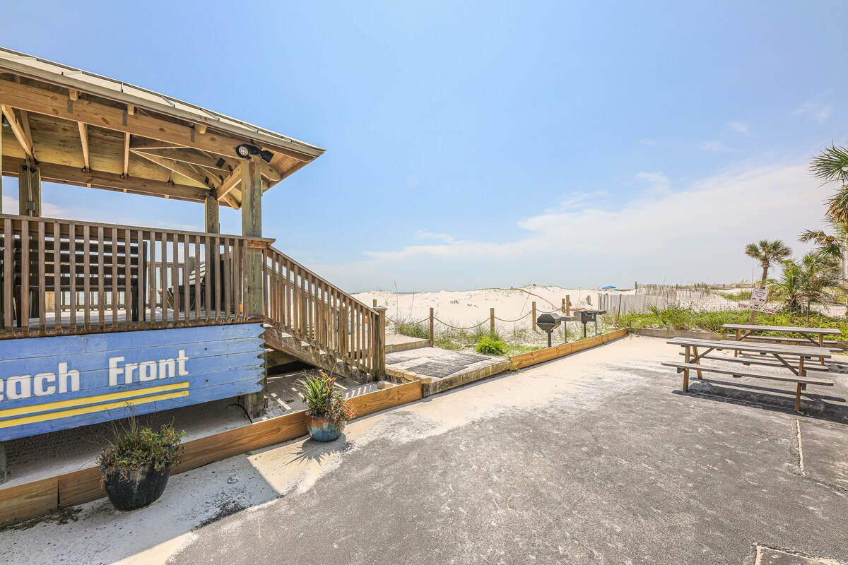 Donde las vistas impresionantes se combinan con una ubicación privilegiada. Disfruta de: - Balcón privado impresionante con vistas panorámicas al golfo. - Sal de tu alojamiento y dirígete a la playa. - Aparcamiento gratuito incluido en la reserva (¡valorado en 30 dólares!). -1 dormitorio tamaño king + literas empotradas + sofá cama tamaño queen. - Piscina privada a pie de playa. - Ubicado en el corazón de Gulf Shores, a poca distancia a pie de The Hangout y mucho más. - ¡Unidad recién reformada! - ¡La designación de «Favorito de los huéspedes» nos sitúa entre el 5 % de los mejores anuncios de AirBnB!