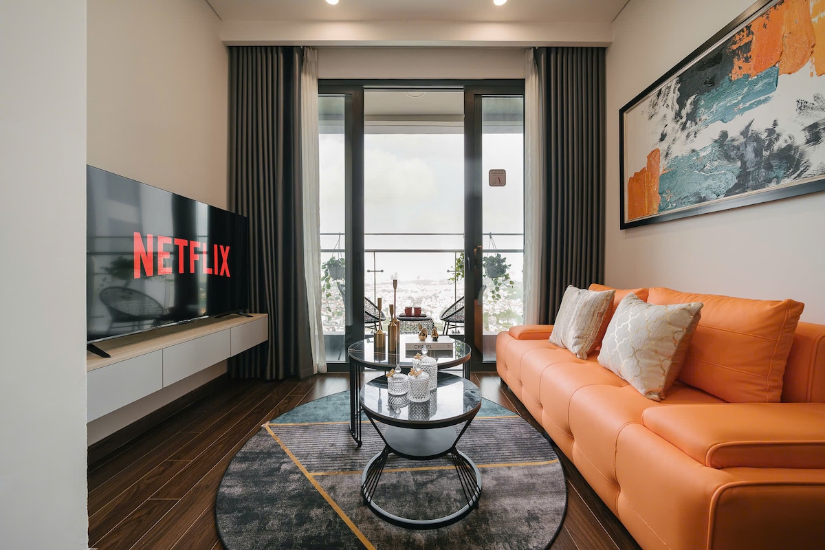 Căn hộ rộng 64m2 thuộc tòa Masteri West Heights -Smart City tầm view Panorama ra công viên trung tâm Central Park, có hồ điều hòa với dải cát trắng rộng 4.8 ha ● Căn hộ 2 phòng ngủ, 2 Phòng tắm, 1 Phòng khách rộng rãi được trang bị nội thất cao cấp, với ban công ngập tràn ánh nắng mặt trời. ● Phòng ngủ với giường Queen size và toàn bộ chăn ga gối đệm êm ái, với điều hòa không khí, giúp cho bạn những giấc ngủ ngon và sâu. ● TV thông minh kết nối WIFI, NETFLIX. ● Tủ lạnh, Máy giặt, lò nướng.