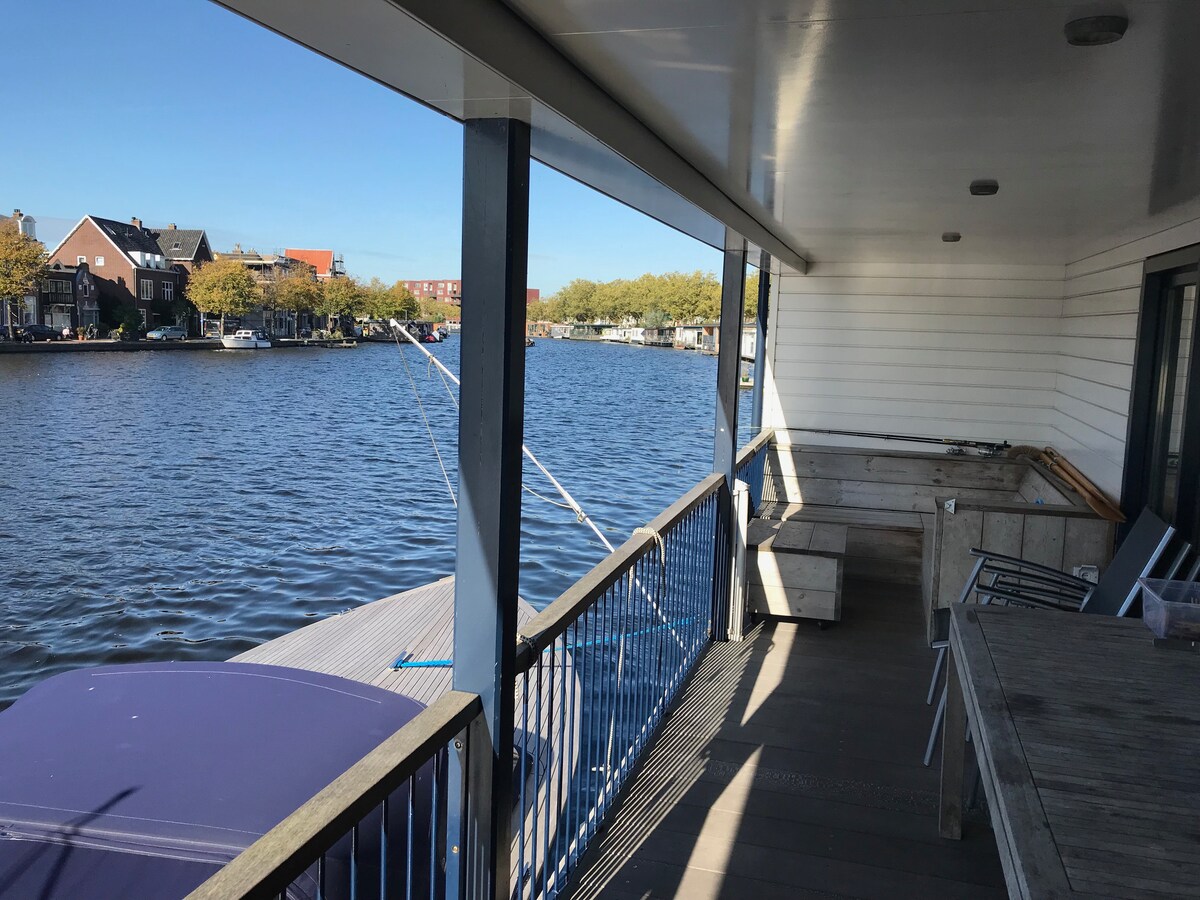 La casa flotante se encuentra en el Spaarne y en la frontera de la ciudad de Haarlem y la naturaleza. Puedes navegar o ir en bicicleta al centro de Haarlem en 15 minutos. Y si estás buscando un paseo, sal por la puerta y maravillosamente a través del Hekslootpolder. Para los niños hay un gran trampolín en el jardín, además hay scooters, tablas de skate, una caja de arena, varias canoas y estantes, que puedes agarrar para subirse al agua.