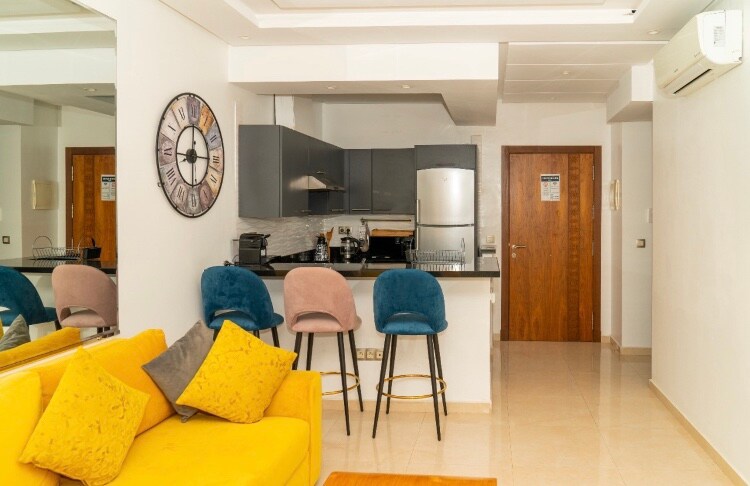 Bienvenido a Krimni Appt. ¡Disfrute de su remanso de paz en Asilah! Este apartamento luminoso y confortable puede alojar hasta 5 personas, ideal para familias que buscan relajación. Residencia familiar segura, con 4 piscinas Cocina totalmente equipada Baño limpio y funcional Balcón con vistas parciales al mar, a 25 minutos de Tánger 🌊 Acceso directo a la playa a pocos pasos para sentir la arena bajo tus pies. 🛗 Ascensor y aparcamiento privado 🛎️Conserje y seguridad 24