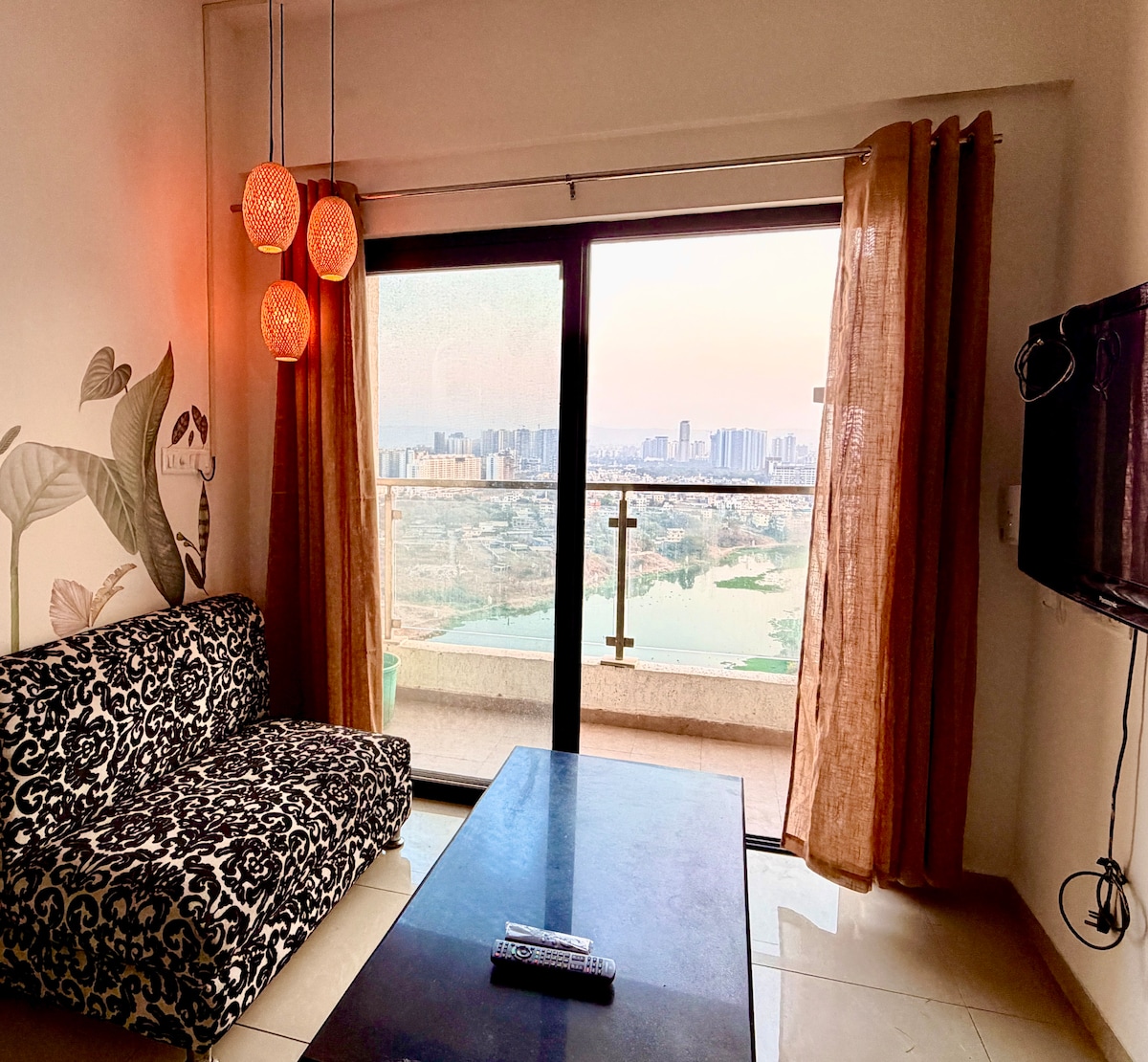 Nest (Suite 1BHK con aire acondicionado) en la planta 32 con espléndidas vistas de la ciudad de Pune. #Sala de estar: Aire acondicionado Smart TV 4KHD de 56 pulgadas 🎶 Experiencia musical con Alexa ECO Libros, cartas y Ludo Sofá cama tamaño queen Mesa de comedor/trabajo con sillas Conexión a internet de banda ancha. Balcón #Cocina americana: Horno microondas Placa de inducción Hervidor de agua 🔥 Tostador French Press Artículos de cocina Crockeries Tazas de café Complementos #Habitación Habitación Aire acondicionado Cama tamaño queen con mesitas de noche Vístete con un espejo Armario Balcón