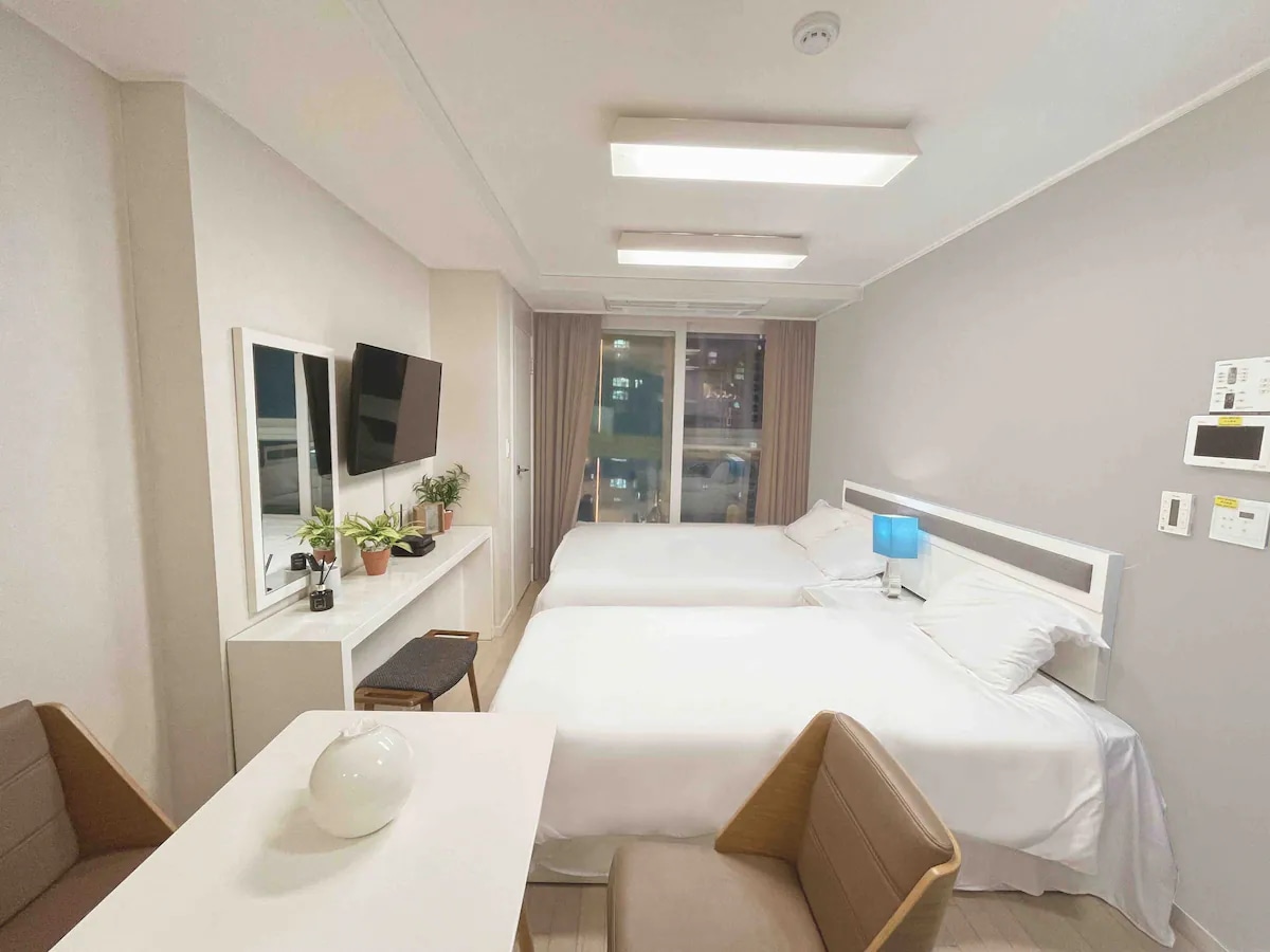 Esta es The House, un elegante alojamiento emocional de una habitación cerca de la playa de Haeundae. La playa de Haeundae está a 3 minutos❤️ caminando. Es❤️ una vista a la ciudad, y se puede ver la vista al mar desde la terraza. Este es un alojamiento de una habitación❤️ para 2 personas. ❤️ El interior, los muebles, la decoración y el estilo te harán sentir cómodo y cómodo. ❤️Instalaciones - TV portátil de pie, aire acondicionado, refrigerador, microondas, hervidor eléctrico, 1 cama queen. - Champú/acondicionador/jabón corporal/lavado de manos, toallas, etc. ※ Debido a la política ambiental, no proporcionamos cepillo ni pasta de dientes.