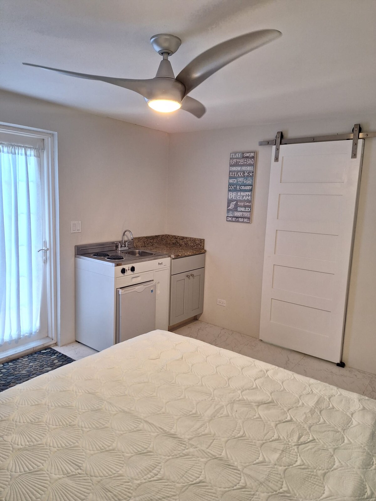 Es una unidad muy pintoresca y ha sido bien recibida por los huéspedes que se han alojado allí. Al mirar por la puerta principal de la entrada de la unidad, puedes ver la piscina que está a 5 pies de distancia. También podrás ver el océano azul claro desde tu cama mientras miras hacia afuera. Es una unidad muy romántica con sus paredes azules que se funden con su entorno.
