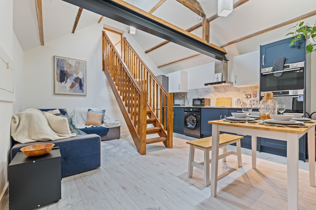 Amplio apartamento estudio moderno en una tranquila calle residencial. Excelente ubicación para explorar los alrededores con muchos paseos por el campo a la puerta y a poca distancia a pie de las tiendas y el transporte del pueblo. Baño y cocina con estilo. Cama tamaño súper king. Televisor Android 4k de 43 pulgadas y barra de sonido. Wifi gratuito. Estufa eléctrica con efecto de madera y radiador eléctrico. Aparcamiento fuera de la carretera. El apartamento es contiguo a nuestra propiedad, por lo que estamos disponibles si es necesario, pero está separado de nuestra casa, por lo que el ruido no es un problema.