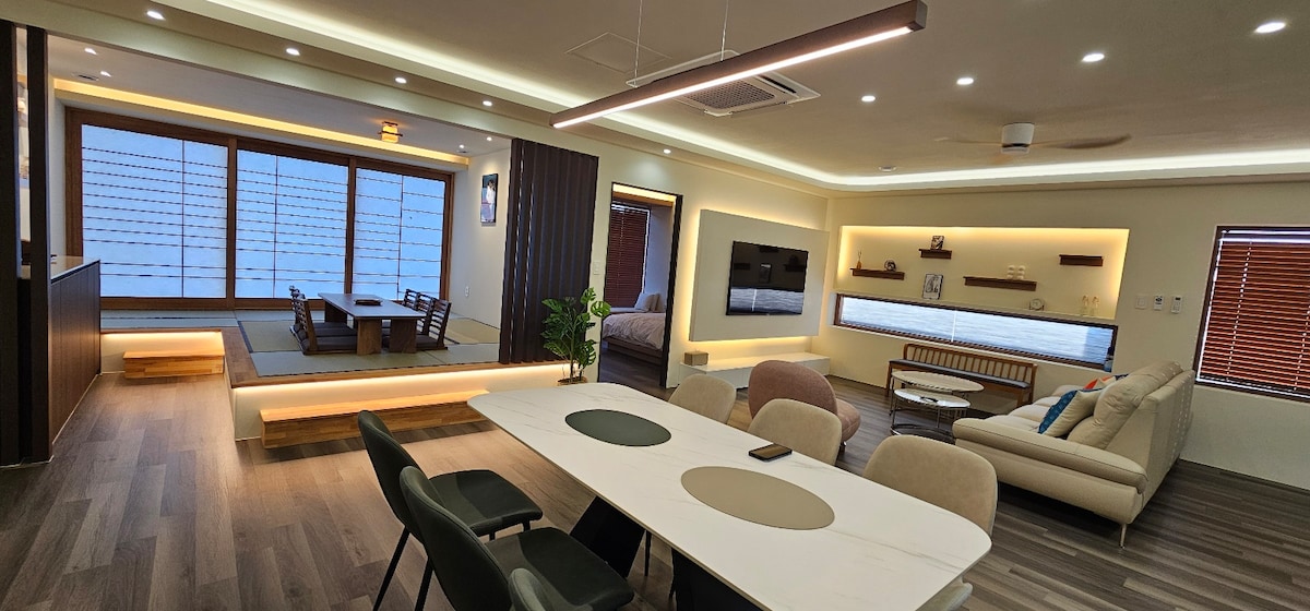 * Confirmación obligatoria antes de reservar - Número de usuarios básicos: 1-5 personas → Solo se puede usar el edificio principal (2 dormitorios + 2 baños) - Cuando se reserva para 6 o más personas, se abre una → casa adicional (incluido el baño) - Si desea utilizar la casa anexa, por favor reserve para 6 o más personas. ※ Por favor, respete el número de personas estándar para un buen funcionamiento. Tomando como motivo arquitectónico 'ser uno con la naturaleza', se diseñó en forma de círculo para escapar de los marcos estandarizados. Y para sentir la tranquilidad del mundo al sentarse cómodamente, la mayoría de los espacios están decorados con tatami. La familia participó en el proceso de diseño para vivir en Rasong Es una casa construida con mucho cuidado. En los últimos años, ha sido un momento en el que solo se podía sentir la naturaleza de Jeju. Ahora quiero compartir la comodidad y la belleza que Jeju ofrece. Quédese cómodamente. {Lasong}