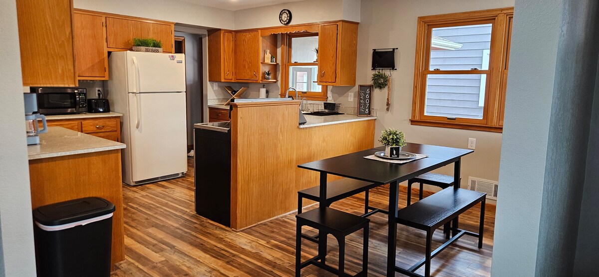 Tanto si estás planeando un viaje a New Ulm para visitar a tu familia, participar en uno de los muchos festivales de nuestras ciudades o buscar un refugio tranquilo, ¡nos encantaría que fueras nuestro huésped en esta casa de Cape Cod recién renovada! El alojamiento puede alojar a 8 adultos muy cómodamente, pero el precio por noche está establecido para dos ocupantes y los huéspedes adicionales cuestan 30 dólares por persona. Esto te permite la opción de alojarte en una casa totalmente amueblada a un precio razonable, ya sea que tu grupo sea grande o pequeño.