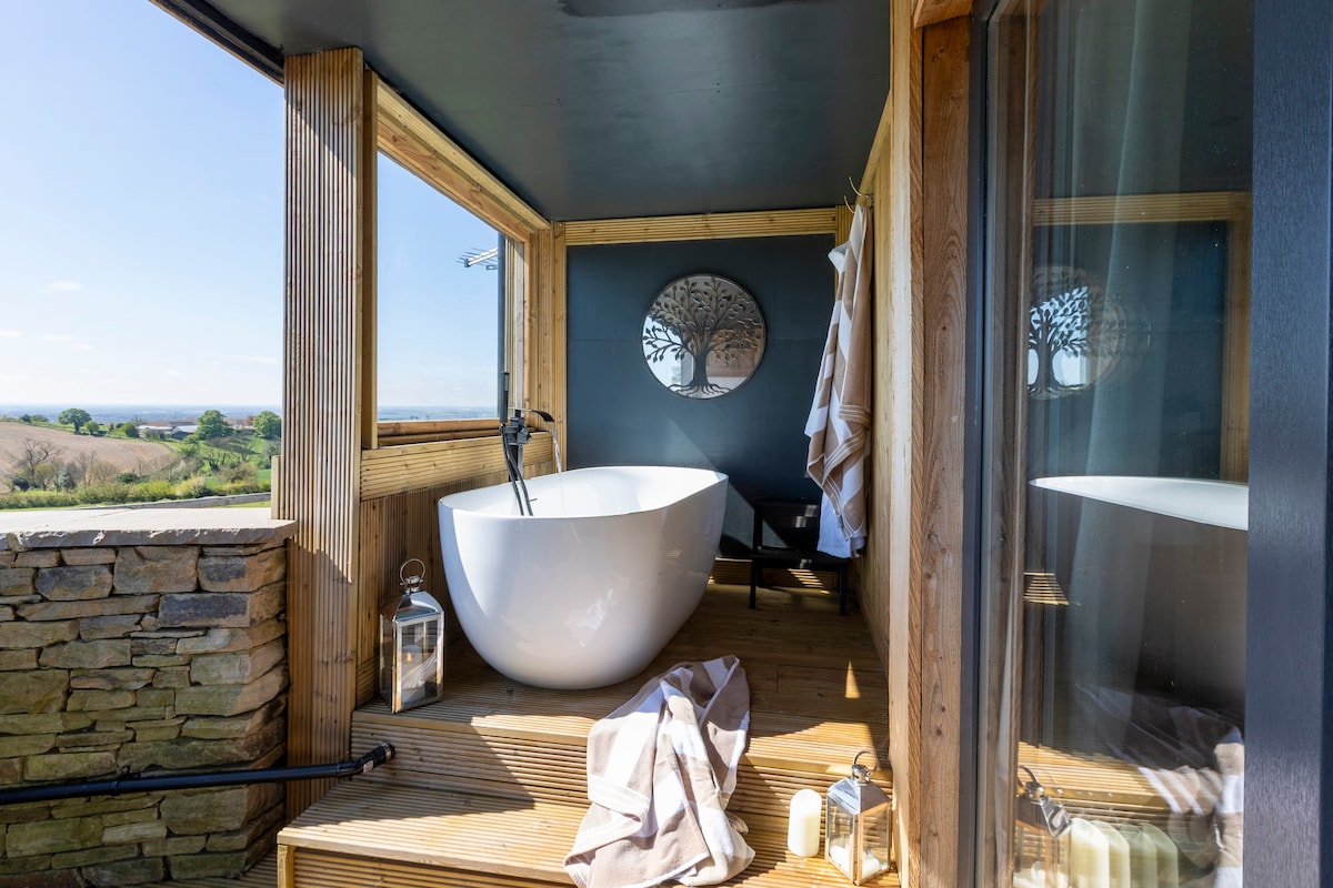 Acogedora cabaña/lodge de madera con calefacción central rodeada de hermosas vistas al campo. Ideal para aquellos que quieran estar a una milla de nuestro pueblo local, pero en una zona tranquila. Paseos para todos los niveles desde nuestra puerta. Se admiten dos perros de tamaño mediano. Los pubs locales admiten perros y tenemos muchos lugares para comer localmente. Vistas increíbles, una estufa de leña, una cama tamaño king con dosel muy cómoda, un sofá cama fácil de usar y una ducha fantástica han recibido comentarios de 5* por parte de muchos huéspedes satisfechos.