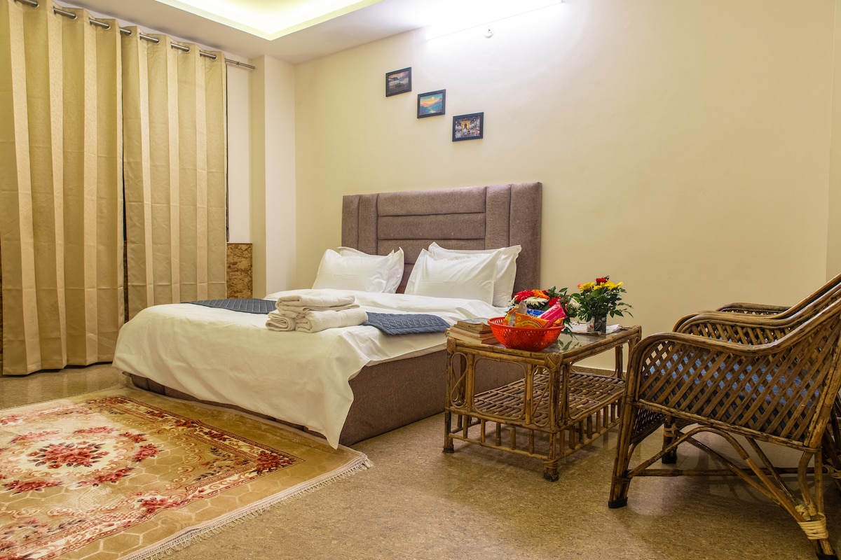 Relájate con toda la familia y amigos en este lugar tranquilo para estar. Desde aquí se puede acceder a todos los lugares. Está cerca del Pentagon Mall . Blinkit y comida en línea a domicilio están disponibles. Hay una cama de matrimonio en un dormitorio con aire acondicionado dividido. Una cama tamaño Dewan en el suelo en otro dormitorio con ventana y aire acondicionado. Y un sofá que es sofá cama se puede utilizar como cama en la sala de estar sin aire acondicionado. Nota: No hay televisión. Hay una tienda en la planta grupal del edificio para todos los comestibles y artículos necesarios.