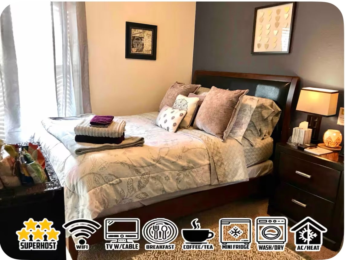 Hello our cozy and comfortable room has a queen size bed with plush pillow top mattress, lots of pillows and blankets, guest only towels, Roku TV with w/Xfinity stream, UV-C air sanitizers, keyless locks, mini fridge and high speed internet. Free large selection of coffee, teas and light breakfast such as hot/cold cereals, bagels, fruit. Bottled water and snacks/sodas available. No curfew after checkin! Low cleaning fee! As our great reviews state we are the best Airbnb out there for the price!