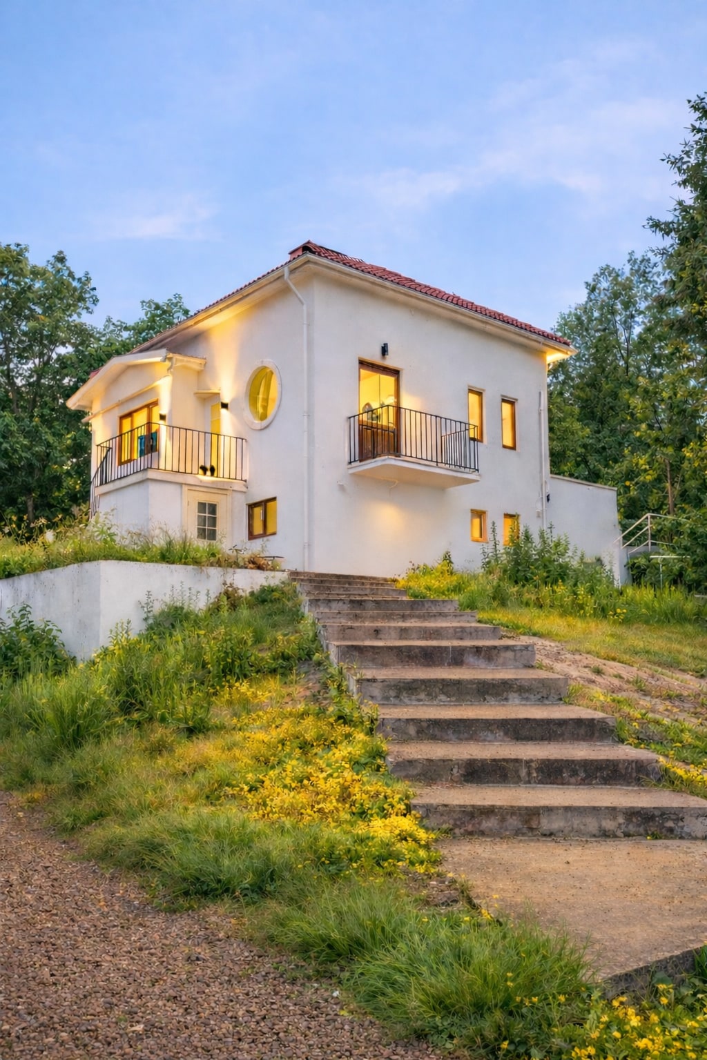 Apartamento privado en una tranquila zona residencial con sol al atardecer.
