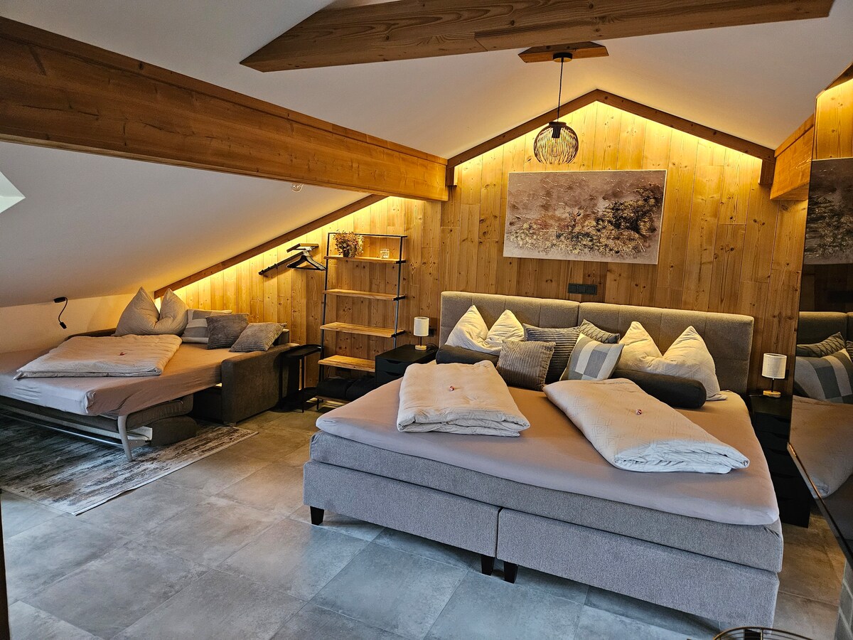 Loft en el estudio Este loft elegante y acogedor en el estudio de Etienne se encuentra en el borde del bosque, a las afueras de Bad Ischl. Los amantes del arte y la naturaleza encontrarán aquí todo lo que buscan. Ponte en contacto directo con el artista Etienne, que pinta en la planta baja del estudio. La vista del pintoresco paisaje de montaña es embriagadora. Desde la terraza del lado este, puedes disfrutar del sol de la mañana mientras desayunas y tienes una vista maravillosa del jardín con estanque y zona de barbacoa.