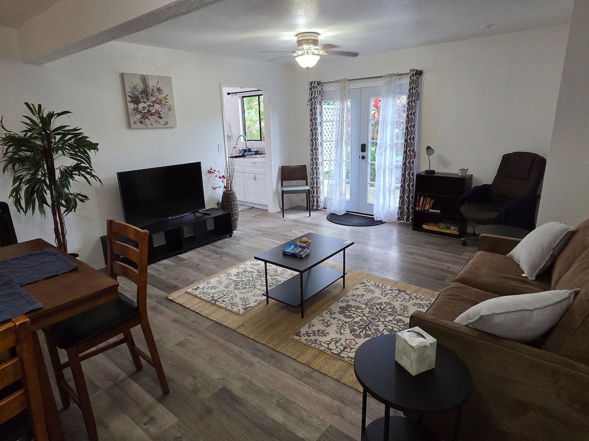 Unidad privada en un encantador oasis abierto de un patio con árboles frutales y arbustos en flor. Tiene su propio espacio de patio sereno dedicado con una mesa de pícnic para disfrutar al aire libre. También tiene su propio aparcamiento dedicado junto a la unidad. La propiedad está convenientemente cerca de todo en Hilo, a unos 10 minutos en coche del centro comercial Prince Kuhio, del mercado de agricultores de Hilo y del aeropuerto. A poca distancia a pie de la Universidad de Hawái - Hilo. Maravillosa ubicación con un entorno seguro y limpio. ¡Wifi disponible!