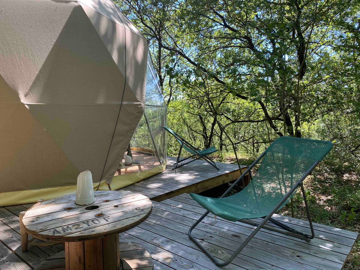 Entre los árboles, en armonía con la naturaleza, cada cúpula, un verdadero nido abierto al bosque , le invita a descansar . Terraza contigua, mesa tumbonas, cojines de meditación, libros . Inodoros secos contiguos (en autogestión) Ducha exterior contigua. Zona de comedor bajo los árboles. Hamacas . En el corazón de los grandes sitios , Lodévois&Larzac , Gorges de l'Herault St Guilhem el desierto ,Gran sitio Salagou circo de Mourèze , Circo de Navacelles La Couvertoirade . Se puede bañar en