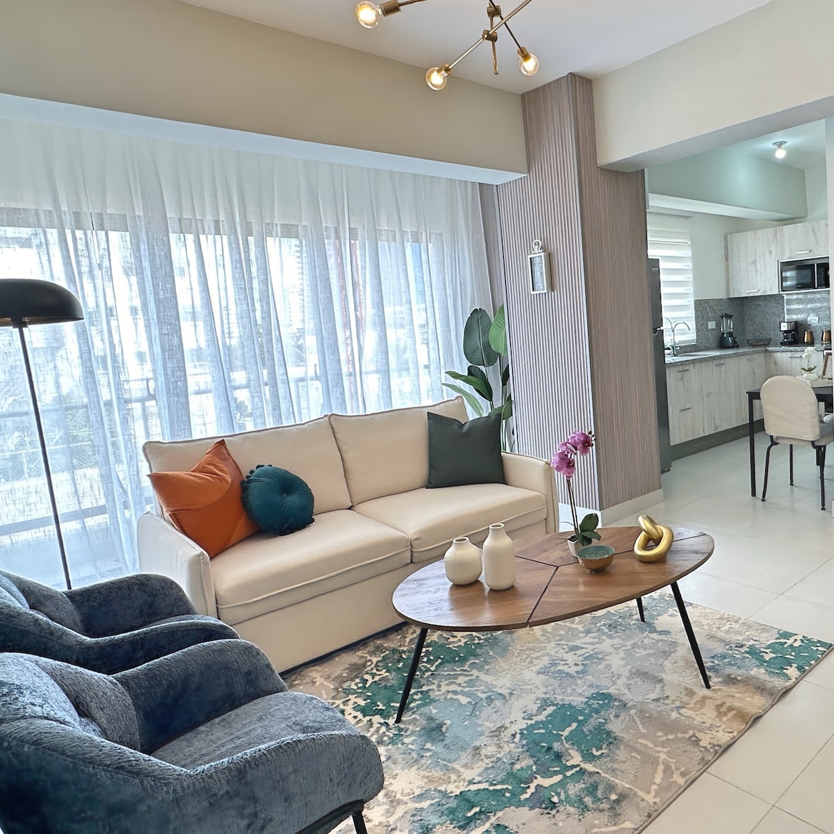 Rodéate de estilo en este destacado espacio. Nuevo apartamento ubicado en el 5to Piso con vista al centro de la ciudad de Santo Domingo. Cuenta con amplia habitación equipada con todas las comodidades para el descanso de nuestros huéspedes; cama King, TV Smart, Aire Acondicionado, Amplio closet, entre otros. El apartamento cuenta con internet de alta velocidad, aire acondicionado central, espacios de trabajo, balcón, cocina equipada y cómoda sala de estar.