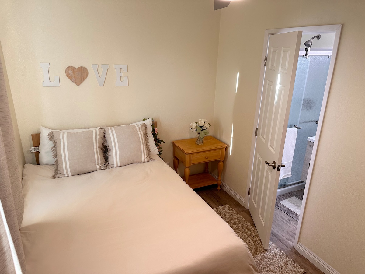 Stay in a newly built guesthouse featuring a fenced outdoor space, modern full kitchen, work desk, and private 1-car parking. Completely detached from the main house for ultimate peace and privacy. Perfect for families, couples, or friends—sleeps up to 4 with a 2-queen beds. Enjoy entertainment, board games, and all the essential amenities in a fresh, clean space designed for comfort and style.