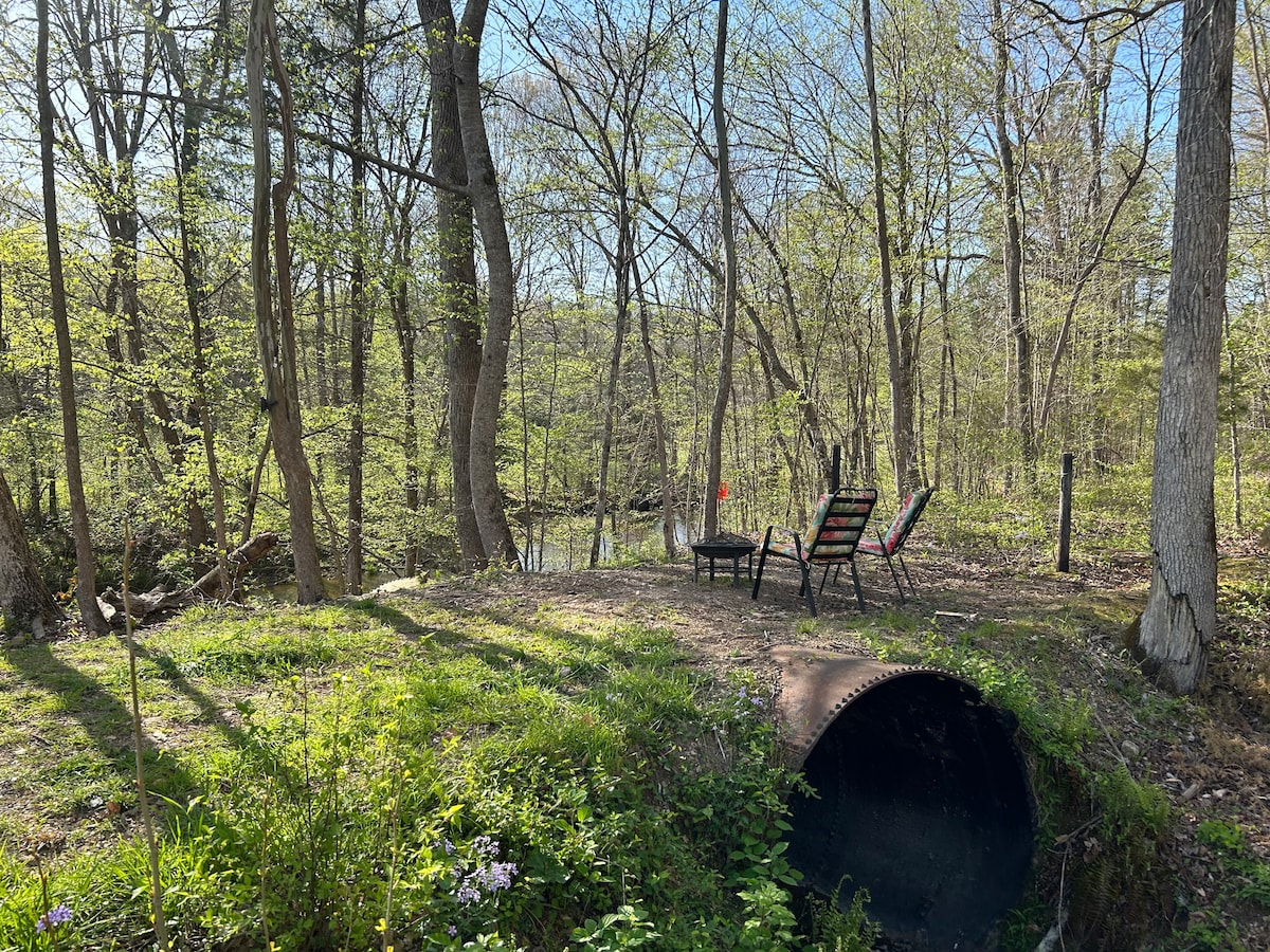 No te olvidarás de tu estancia en este lugar romántico y memorable. Está situado cerca del arroyo y tiene un arroyo fresco alimentado por manantiales que atraviesa él. Estarás rodeado de naturaleza y tendrás un corto paseo para contemplar el estanque. El camino a este camping pasa por una presa de 25'con el arroyo a un lado y el estanque al otro. Conduce con cuidado mientras cruzas la presa. Está en el borde de la línea de la propiedad, que está marcada con líneas naranjas en los árboles. Por favor, sé consciente de quedarte por nuestra parte.