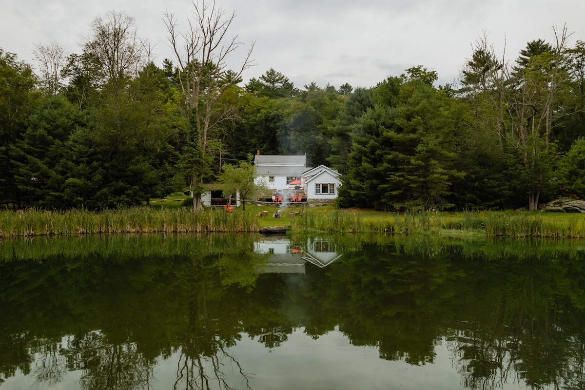 Privacy on 7 acres! WiFi extender, so everywhere. Private dock w/ rowboats on residents-only, motor-free Bodine lake. Bass fishing, big TV, stocked kitchen (le creuset dutch oven, one pot, kitchen aid mixer, bean grinder, milk frother, coffee maker) hot tub, gas grill, firepit. Expansive lawn, ponds, trees, benches, games. 15 min from popular Narrowsburg -- cute shops, great food, antiques. 7 min to Barryville farmer's market or Barryville Oasis restaurant w live music