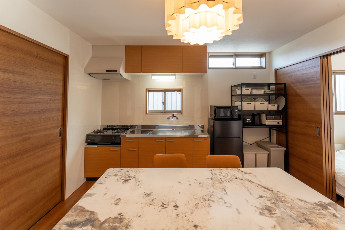 Un apartamento de 2DK construido en 2025. ** Tiene capacidad para 6 personas (cómodo para 4 personas) ** y también está equipado con una cuna. Se incluye una plaza de aparcamiento gratuita, por lo que es ideal para familias, grupos y estancias largas. Hay un supermercado (2 minutos), una tienda de comestibles (3 minutos) y una farmacia abierta las 24 horas (3 minutos) a poca distancia, por lo que puedes alojarte cómodamente como si vivieras allí.A 6 minutos a pie del ferrocarril eléctrico de Kumamoto «Kenchomae», a 5 minutos en coche del jardín botánico de la ciudad de Kumamoto (estatua de One Piece Chopper).También está a 20 minutos en coche del aeropuerto de Aso Kumamoto y de la estación de Kumamoto, por lo que el acceso es excelente. Un espacio cómodo y de nueva construcción Interior limpio y tranquilo.Recomendado para familias, viajes de negocios de larga duración y viajes de trabajo.