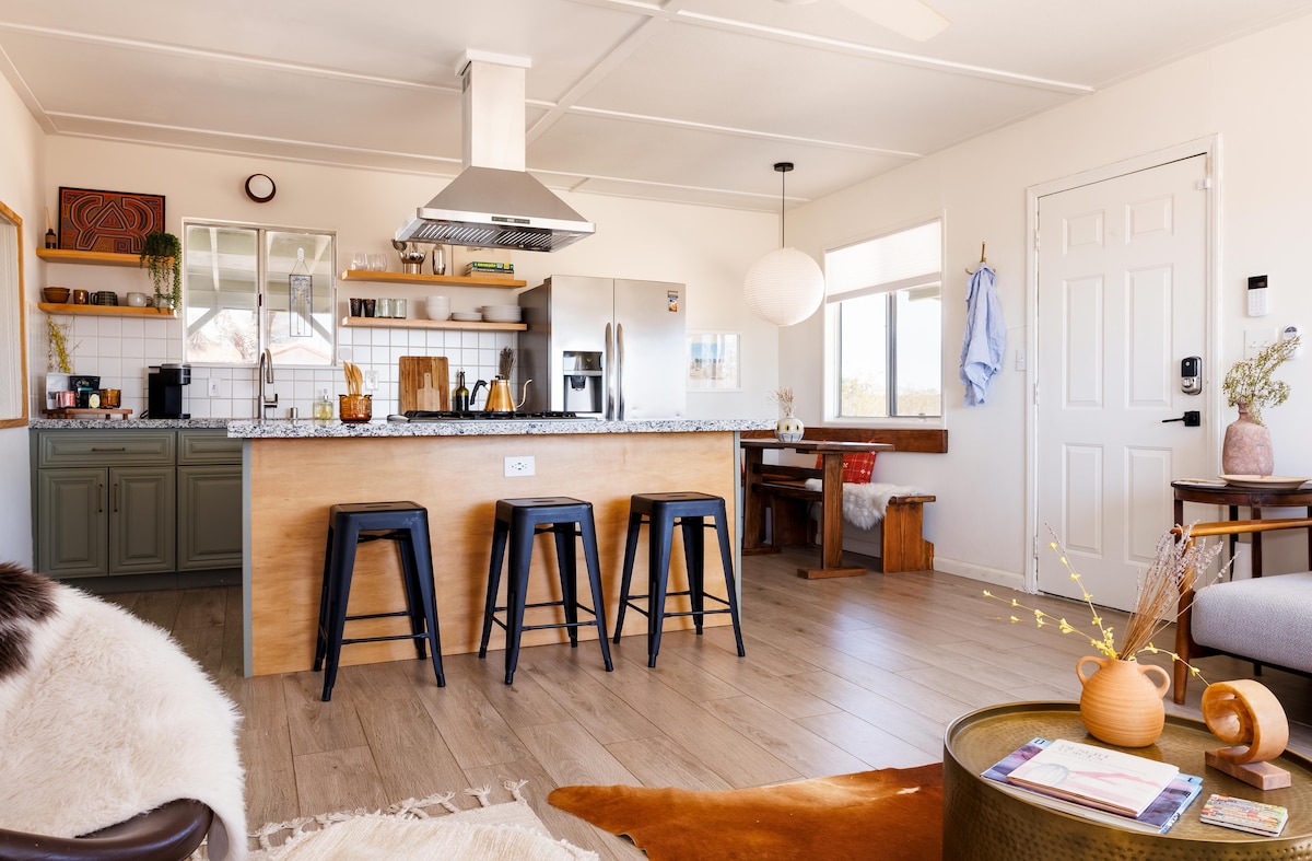 Nuestra cabaña es una cabaña de granja totalmente restaurada ubicada en una zona muy remota por un camino de tierra privado rodeado de acres de tierra desértica virgen protegida y muy pocos vecinos. Estamos a 10 minutos en coche de los principales lugares de interés locales y a menos de 15 minutos del centro de Joshua Tree. La cabaña se encuentra en 5 acres con vistas panorámicas de 360 grados, cielos oscuros para observar las estrellas, impresionantes amaneceres y puestas de sol, y una belleza desértica sin fin. Esta cabaña fue rediseñada para aquellos que buscan restablecer y reconectarse con su naturaleza salvaje.