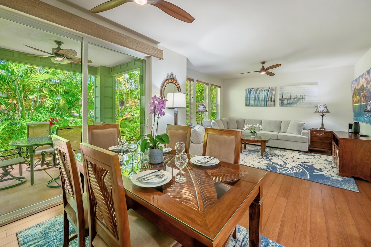 ¡Bienvenido a Sunny Poipu Beach! Esta encantadora unidad del segundo piso en Kiahuna Plantation te hace sentir como en casa! Relájate en tu lanai privado con vistas al jardín mientras estás a pocos pasos de la arena. Lugares de surf, largos paseos y playa con salvavidas están al alcance de la mano. Wifi rápido de 200mgb, cocina totalmente equipada, aparcamiento gratuito, registro las 24 horas sin problemas con tarjeta llave, cama king size, baño completo y lanai extragrande con mesa de comedor y tumbonas en el lanai también.